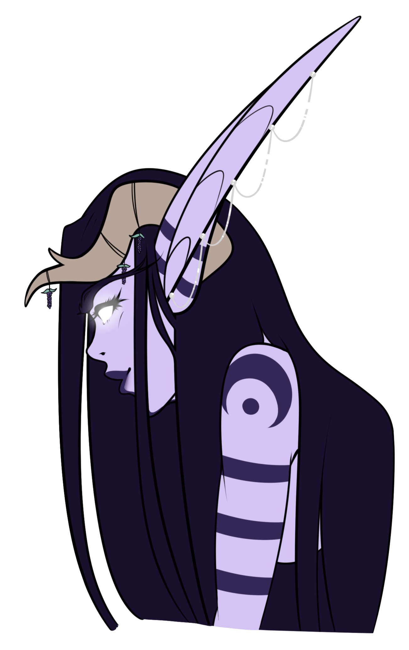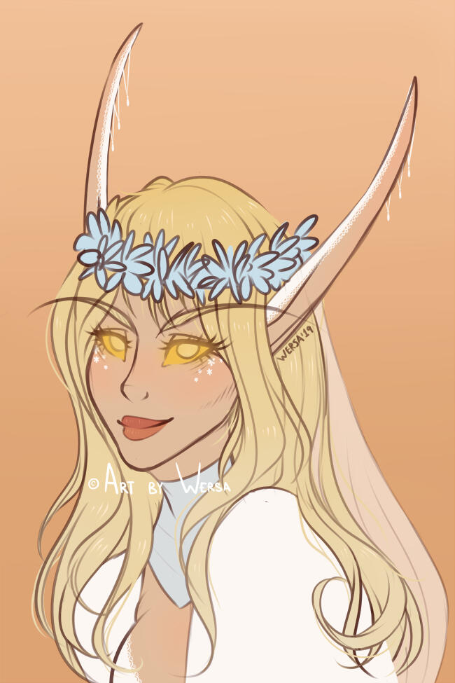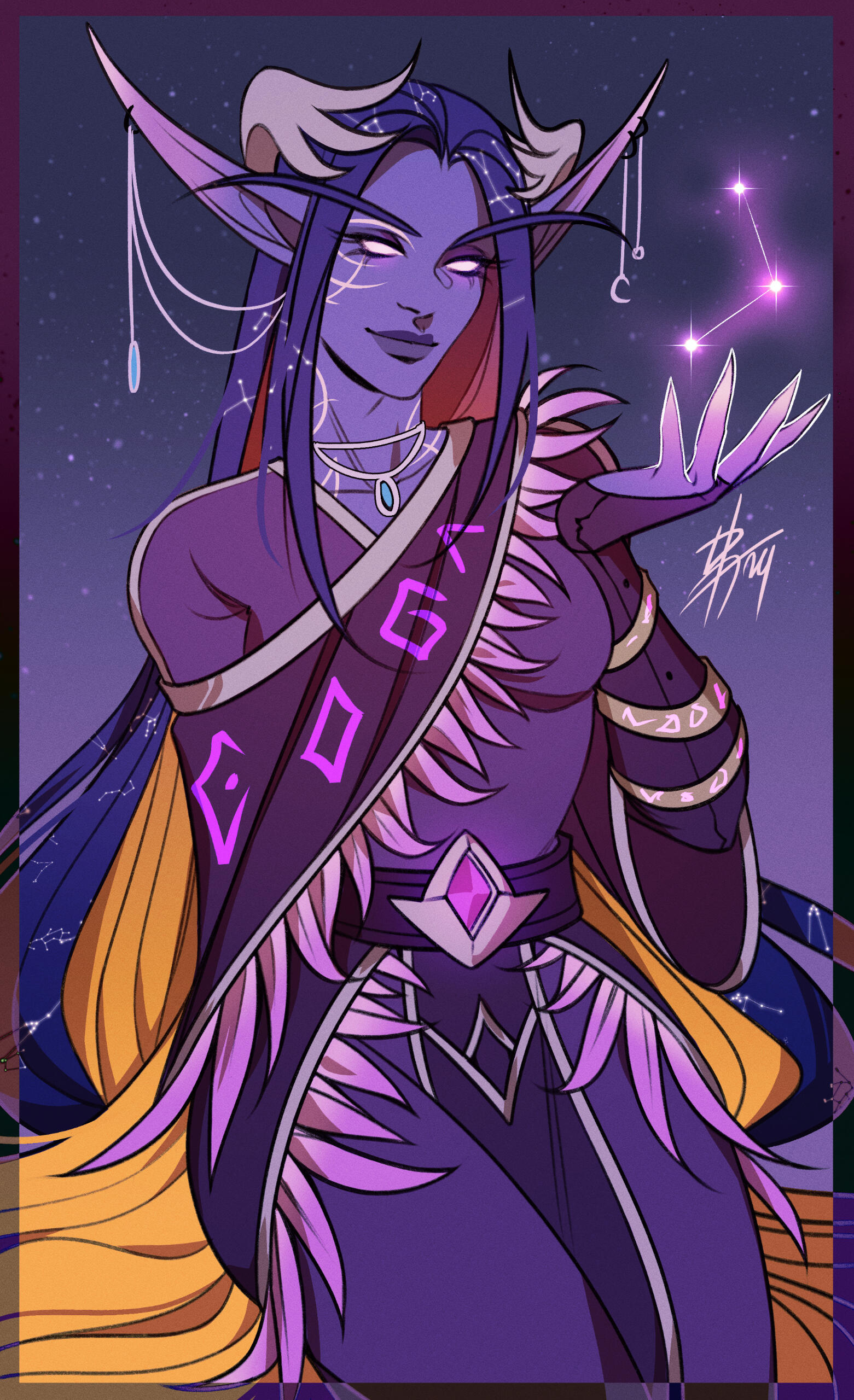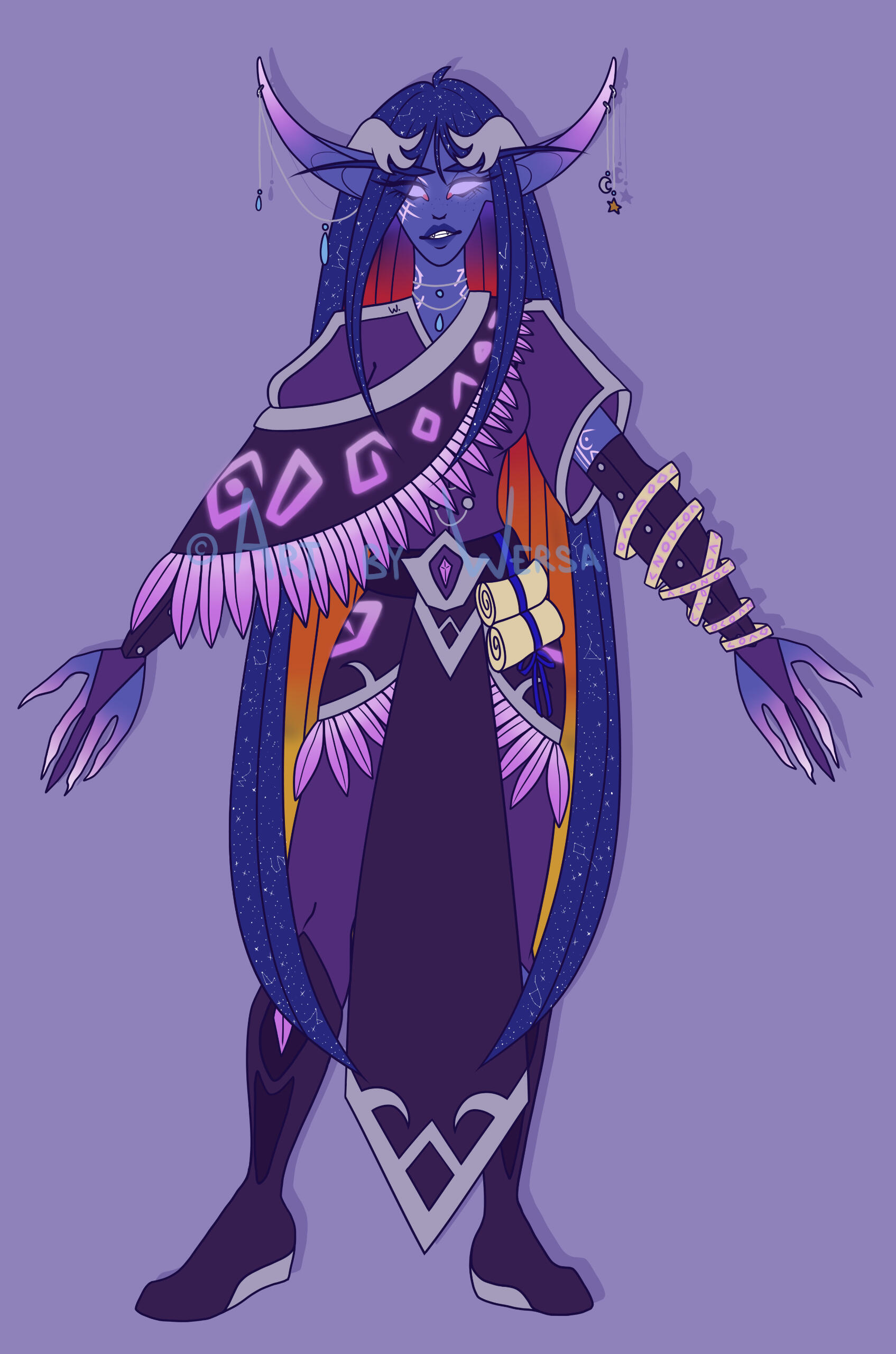 Aesthetics : Magic, especially arcane, potion making / alchemy, constellations, the universe, starry nights, sunsets and sunrises, the color purple, silks and fancy clothes, magical items and tomes.Design notes : Lythes has a tall and curvaceous build. Her hair has twinkling, small constellations and stars scattered on the outside while the inside is reminiscent of a sunset. She usually wears shawls and Shal'dorei silks.Don't hesitate to ask me if you are unsure about something!Important details to remember when you are drawing Lythes :