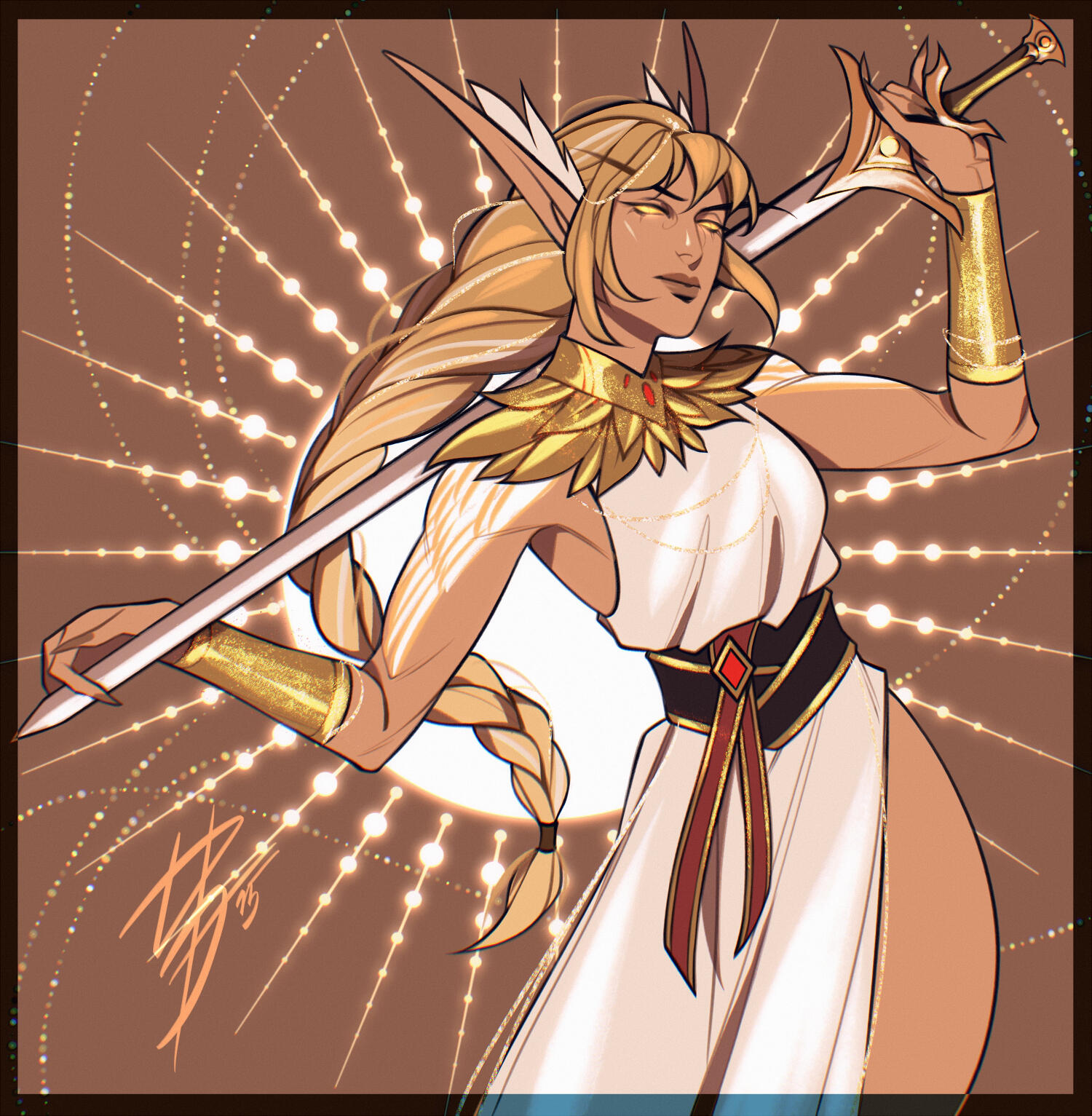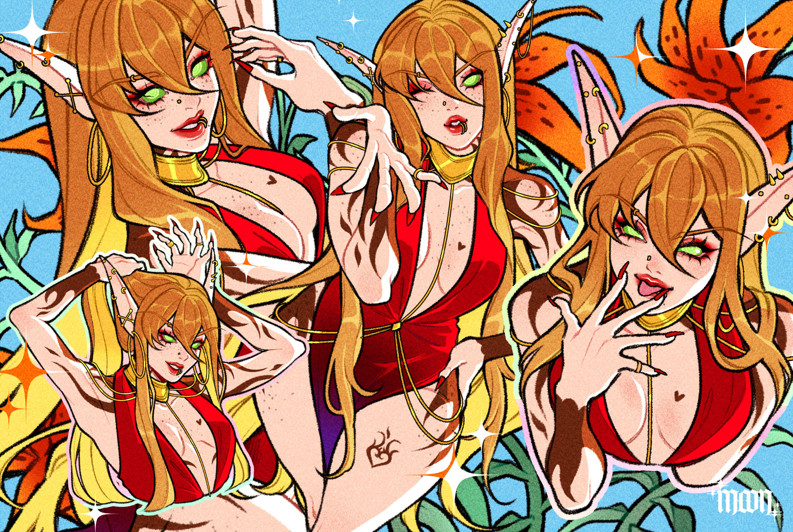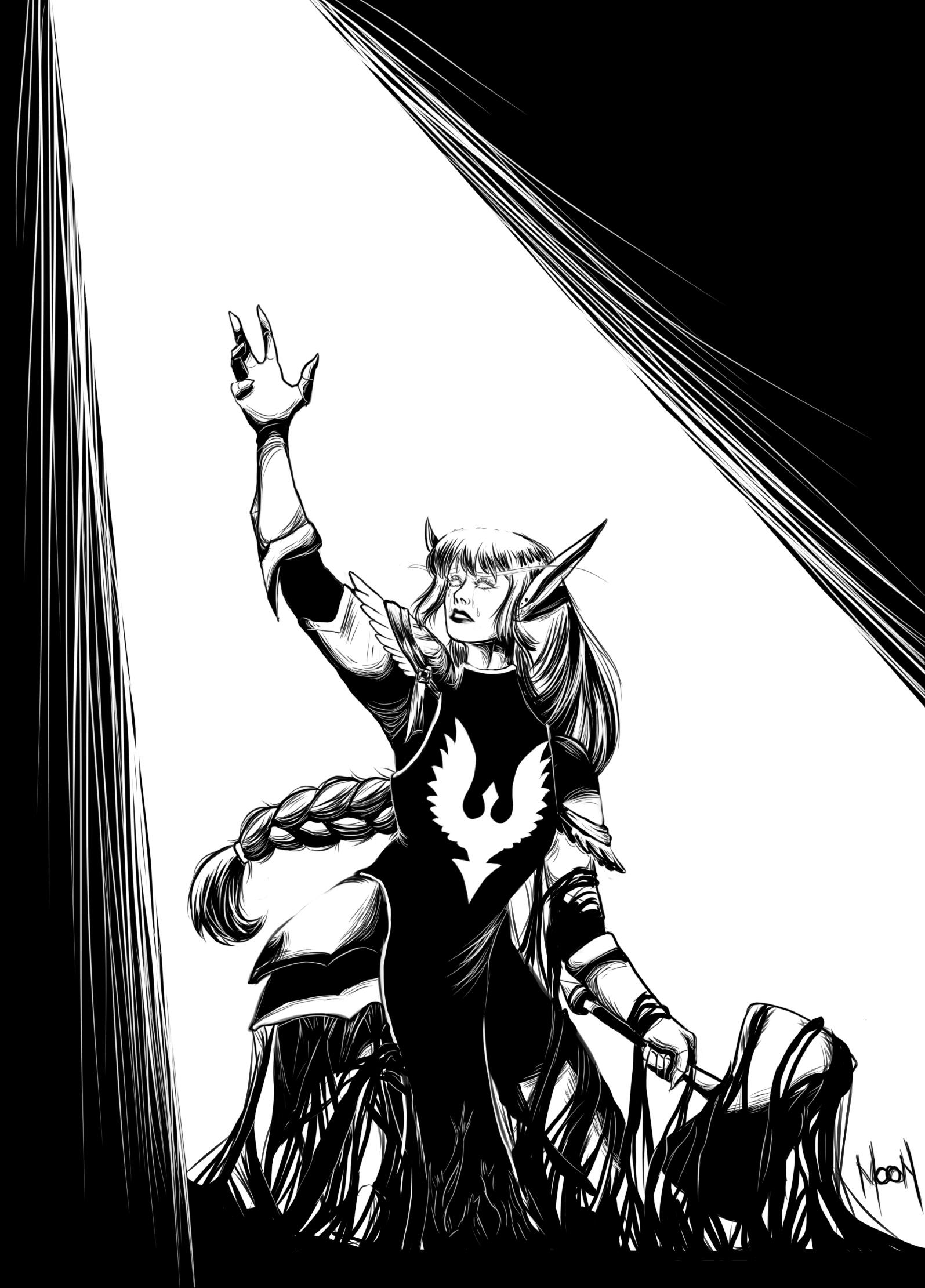 Aesthetics : Magic, especially arcane, potion making / alchemy, constellations, the universe, starry nights, sunsets and sunrises, the color purple, silks and fancy clothes, magical items and tomes.Design notes : Lythes has a tall and curvaceous build. Her hair has twinkling, small constellations and stars scattered on the outside while the inside is reminiscent of a sunset. She usually wears shawls and Shal'dorei silks.Don't hesitate to ask me if you are unsure about something!Important details to remember when you are drawing Lythes :