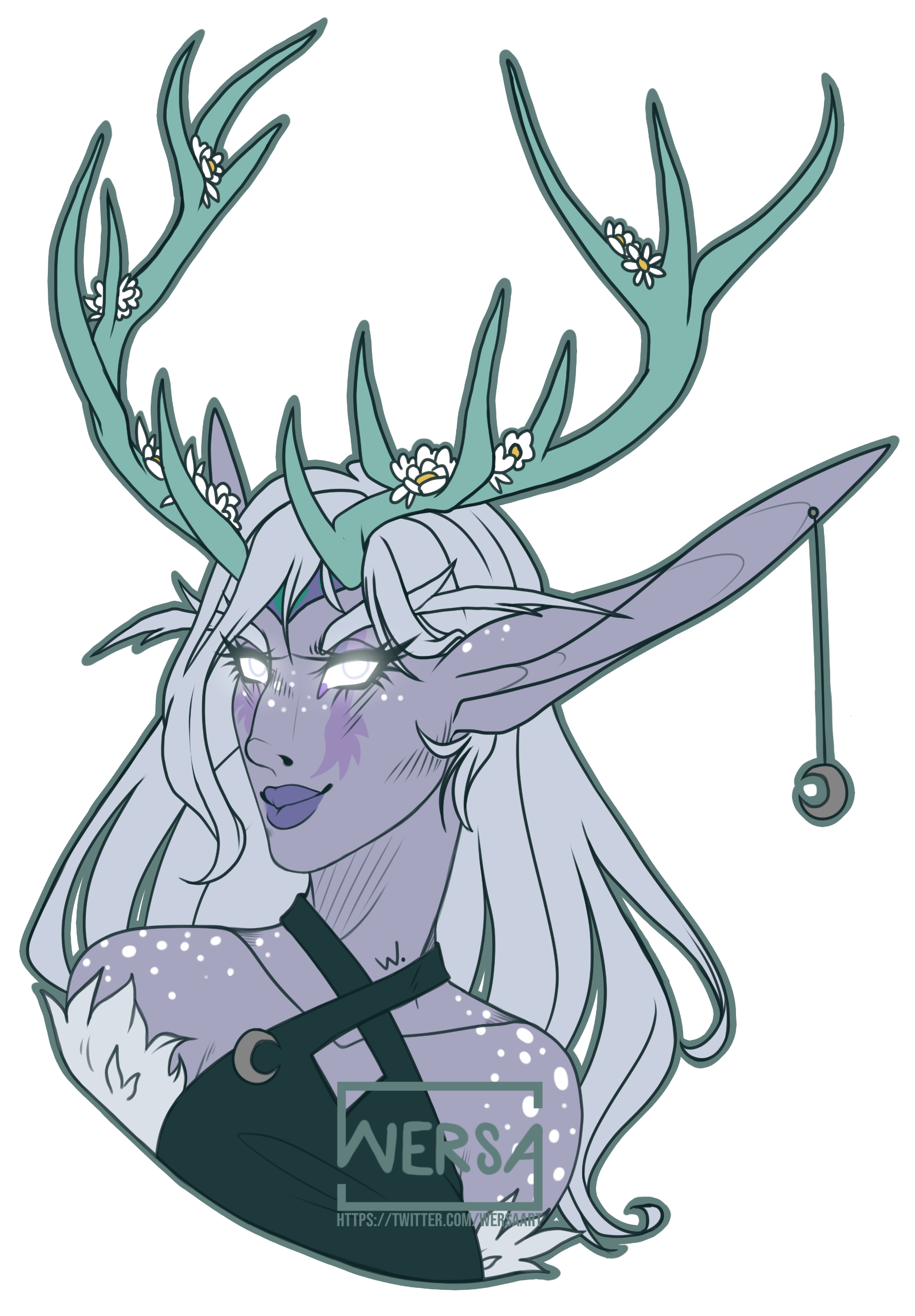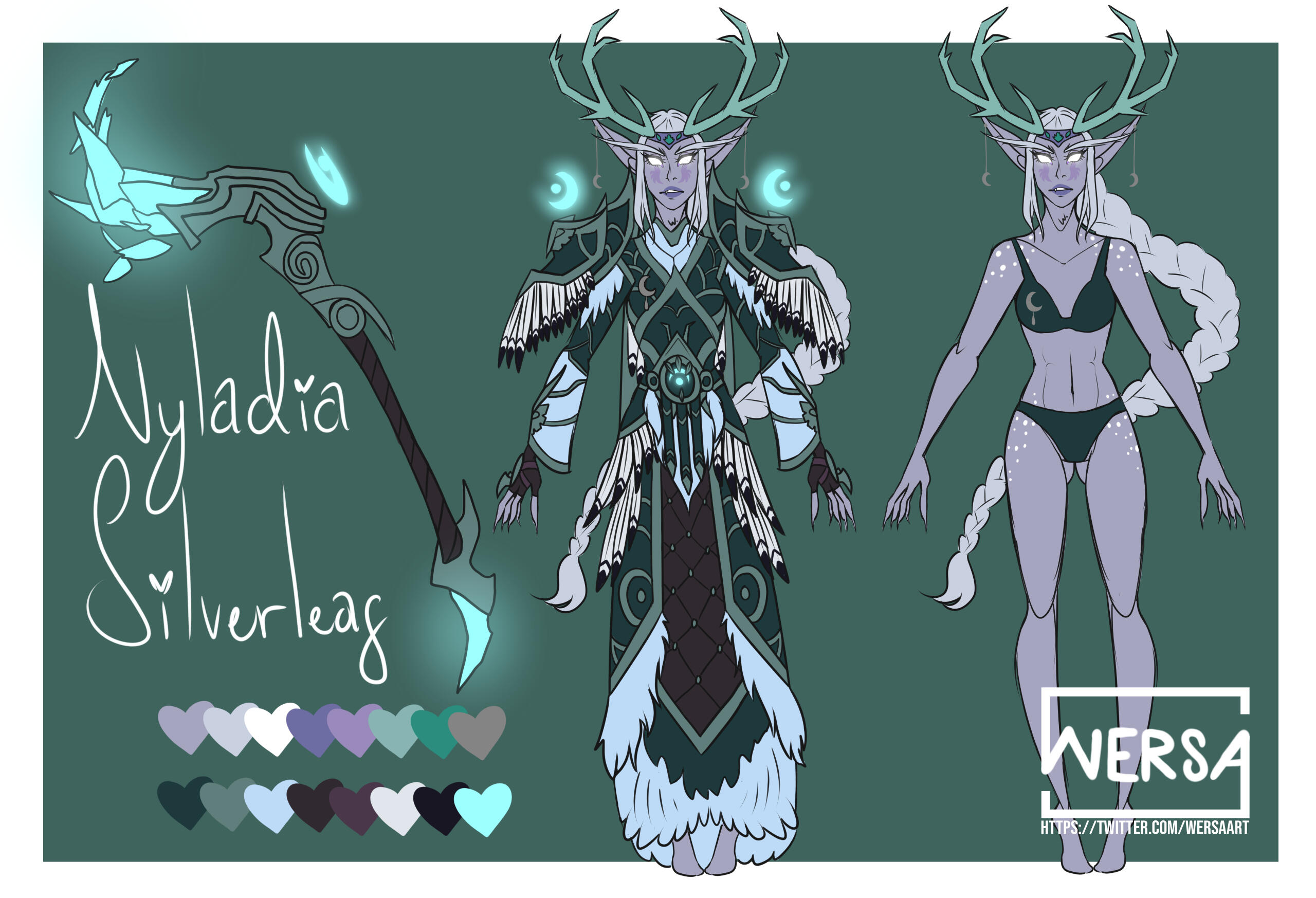Aesthetics : Nature, crystals, druidic themes, deer, the moon, balance in all things, gentle and delicate body language, elven grace dialed up to the max.Design notes : Nyladia is tall and has an incredibly slender build. Her hair is thick and usually braided. Antlers are optional, as they are part of a headdress but she'll look weird without them ngl.Don't hesitate to ask me if you are unsure about something!Important details to remember when you are drawing Nyladia :