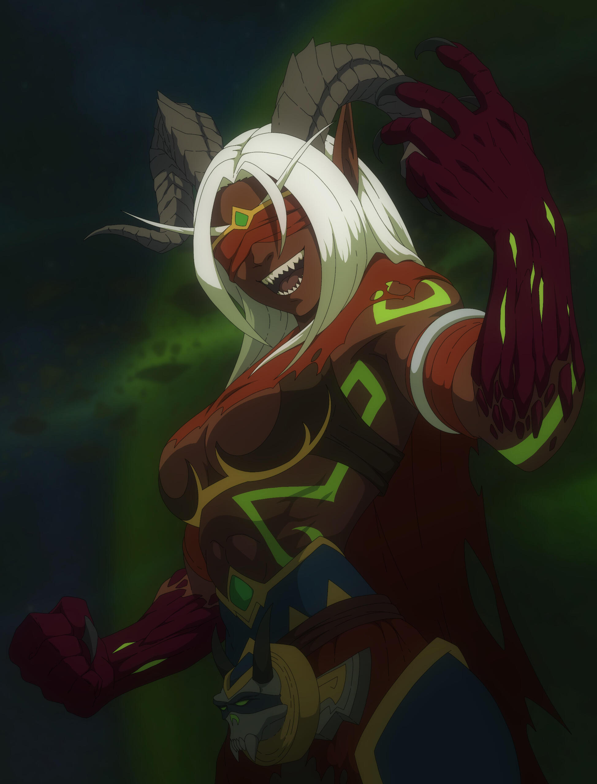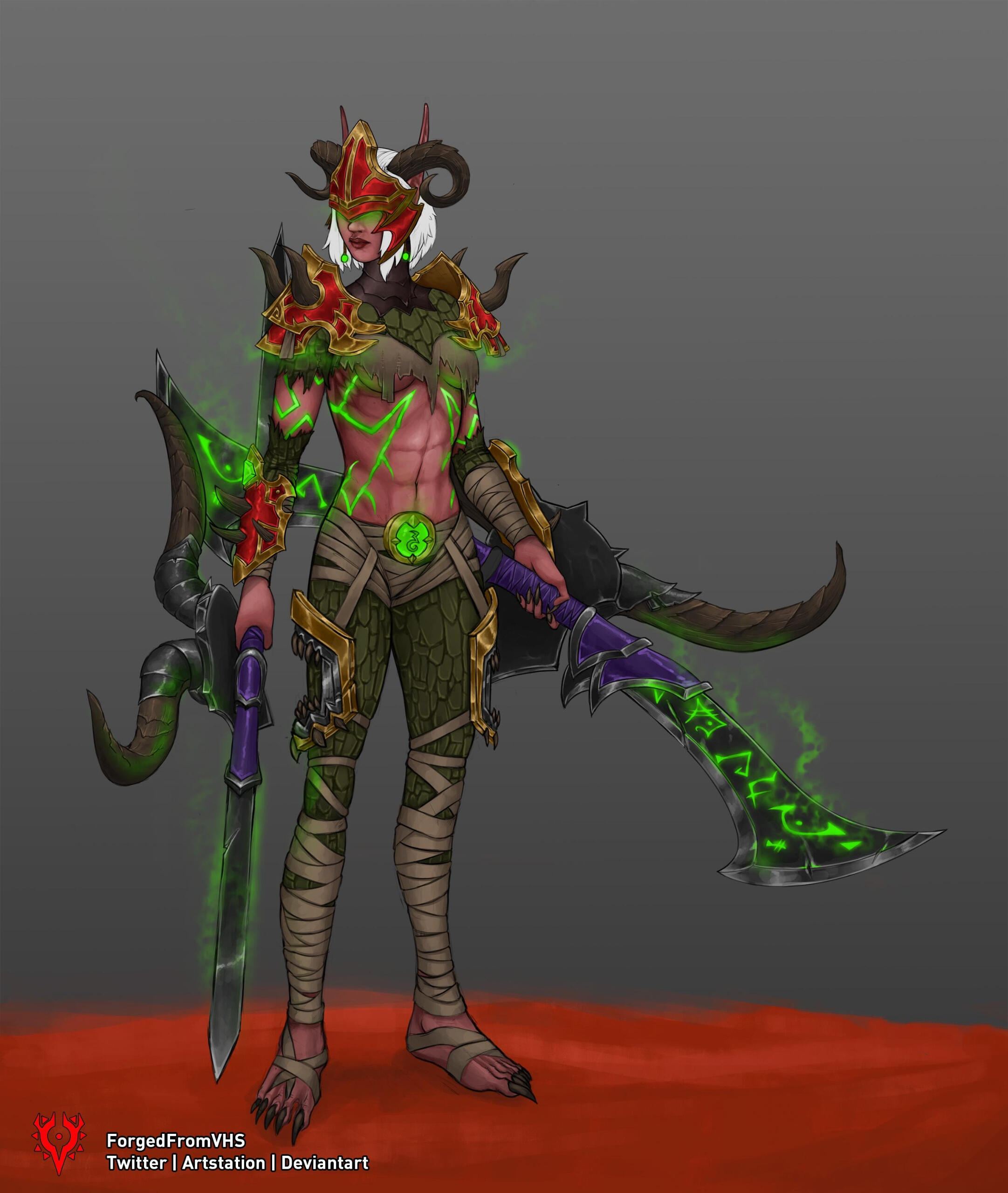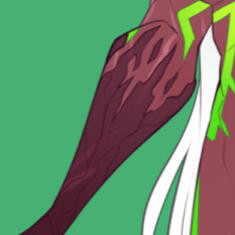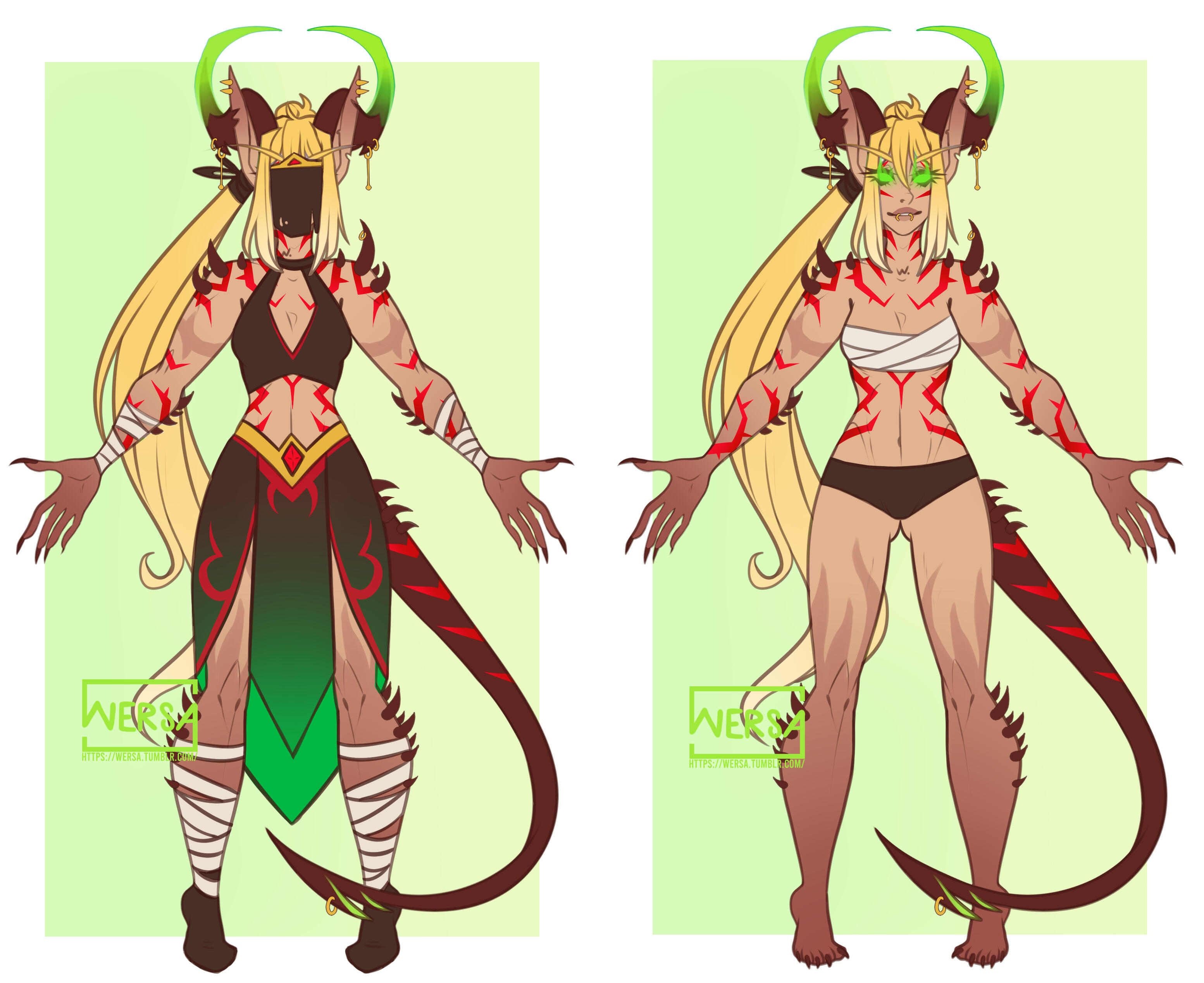 Aesthetics : Purples and greens, clawed hands, curled horns, demonic energies, inner struggles, rows upon rows of fangs, an insatiable appetite.Design notes : Muscular, toned and athletic, bottom heavy body type. Her hair is long but can be kept in a ponytail. Her hands and forearms are coverend in scales, same as her feet up to her knees. Her tattoos are fel green of color. Her skin color is reddish ( top bar ) while her scales are a darker reddish brown ( bottom bar ) :