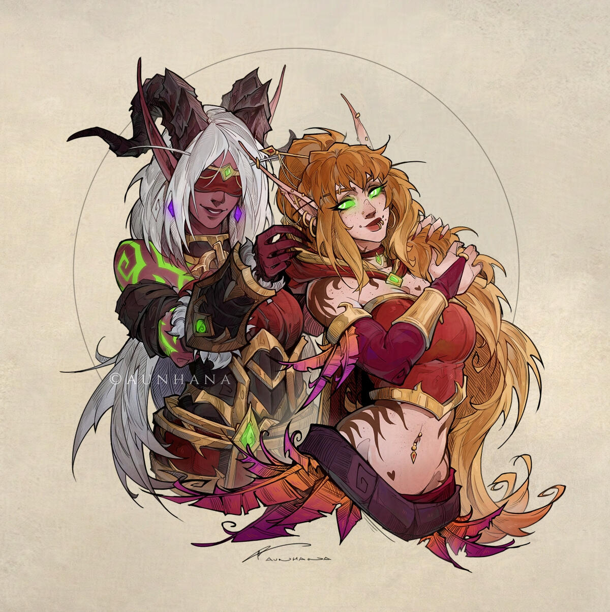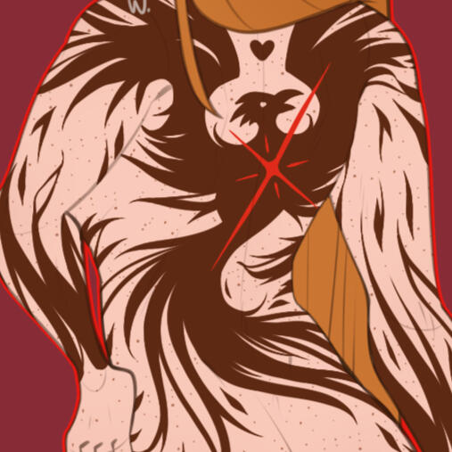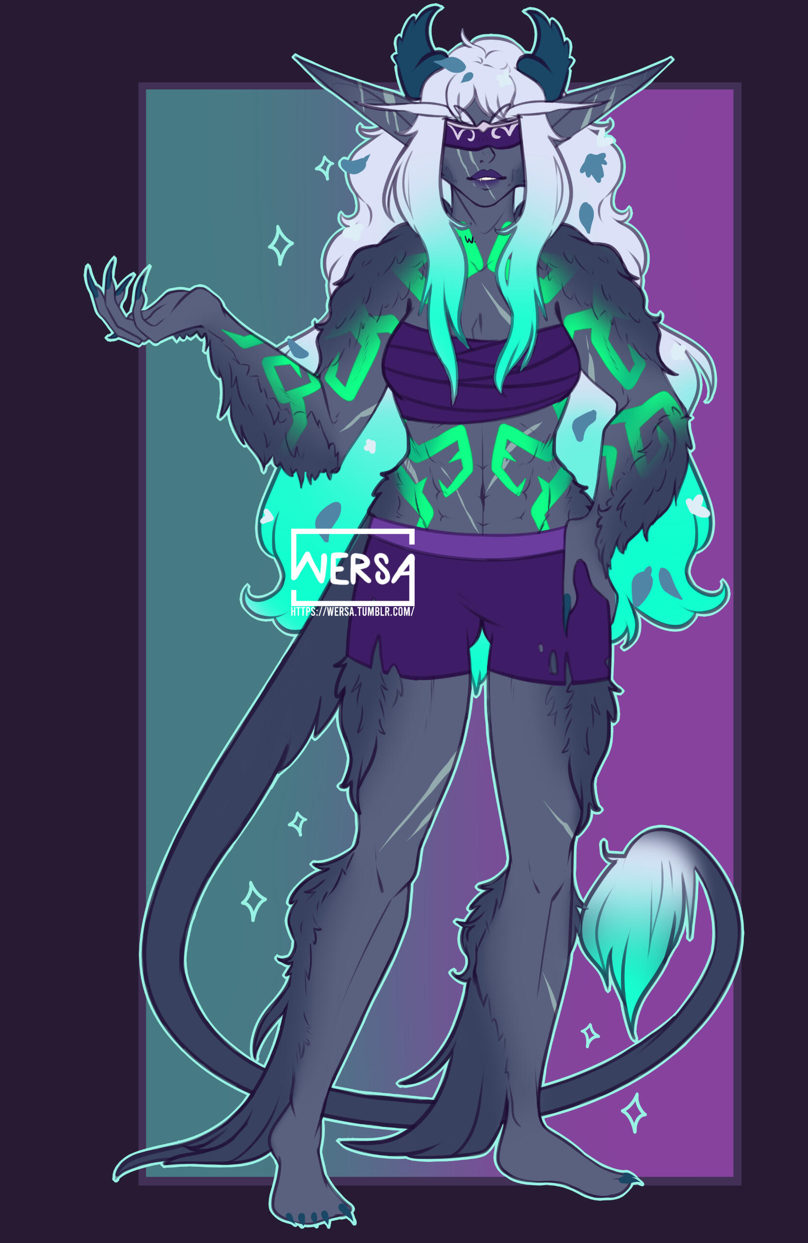 Aesthetics : Whips and slim blades for weapons, clawed hands, scars, fel fire, a looooot of fur / hair, nature.Design notes : Nymona has a muscular build, and is covered in fur like a Satyr. She is a Demon Hunter, which means that she tends to wear a blindfold! Seriously, she is fluffy though! The scars on her ref are drawn lighter to be noticeable, but in actual illustrations feel free to fade them a bit.Don't hesitate to ask me if you are unsure about something!Important details to remember when you are drawing Nymona :