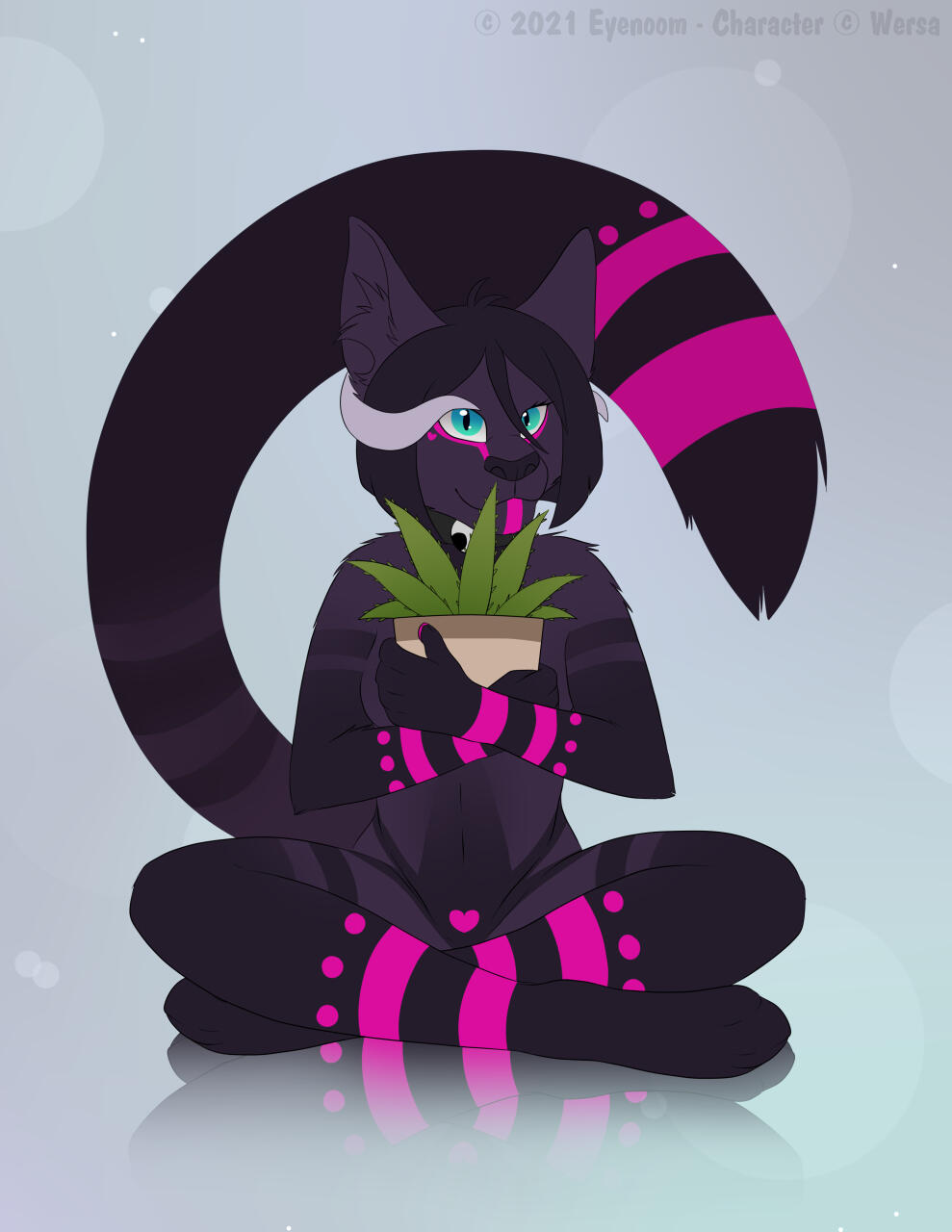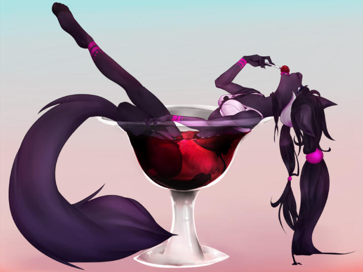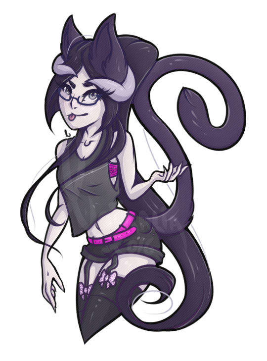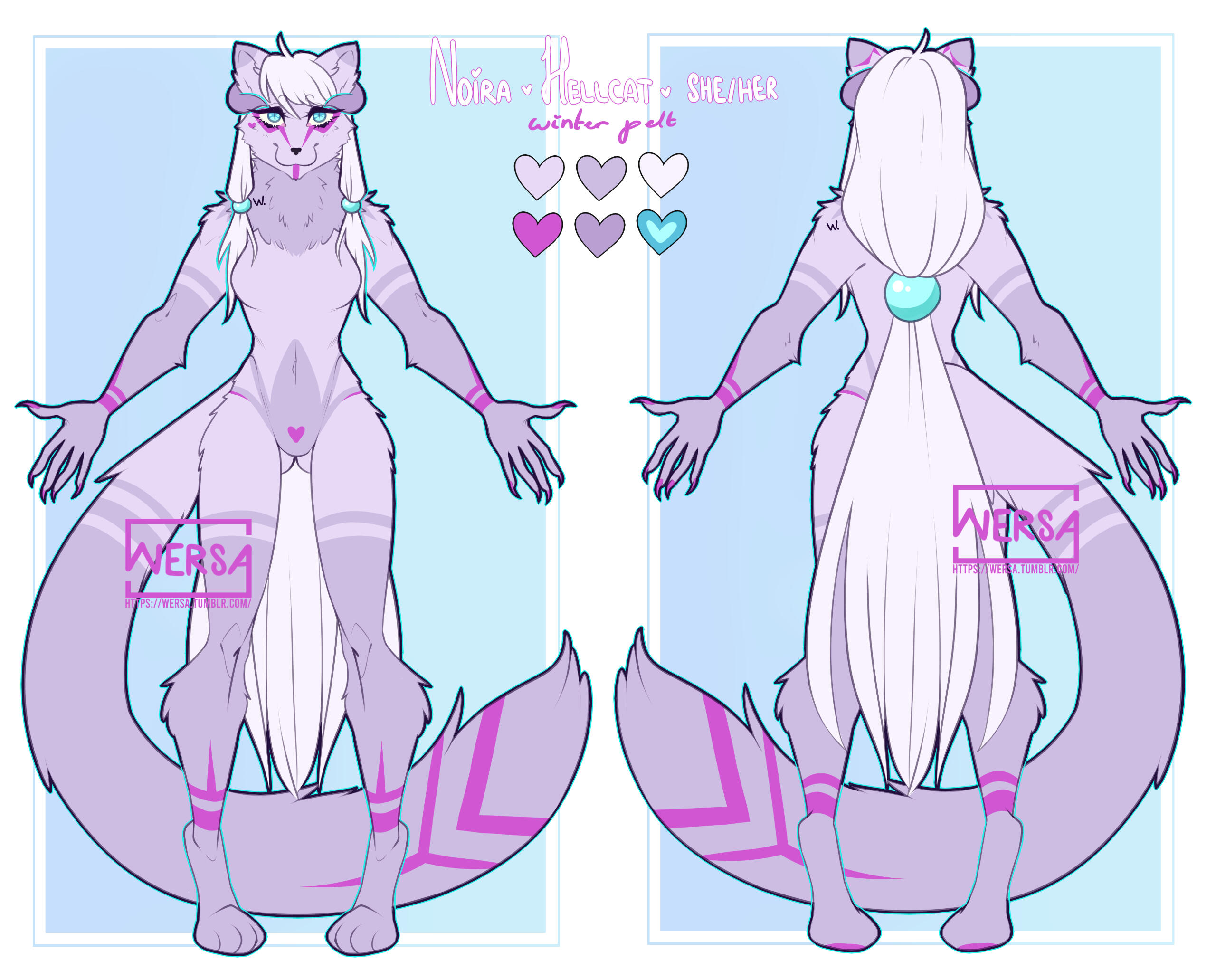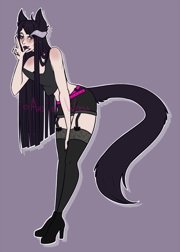 Aesthetics for summer pelt : Lace, leather, denim, thigh highs, tank tops, crop tops, skirts, shorts, hoodies, vests, bold perfumes.Aesthetics for winter pelt : Lace, silks, thick fabrics, sweaters, scarves, ponchos, jackets, thigh highs, leg warmers, gloves, more muted, sweet perfumes.Design notes : Noira is a little on the skinny side, relatively tall. She switches between her two fur coats over the year. In summer, her fur is dark with neon accents while in winter, her fur turns lighter and thicker, more pastel. Tends to wear little to no clothes in her demonic form - though she may wear clothes in her humanoid form. Her tongue ( which is the same color as her markings, by the way. ) is pierced.Don't hesitate to ask me if you are unsure about something!Important details to remember when you are drawing Noira :