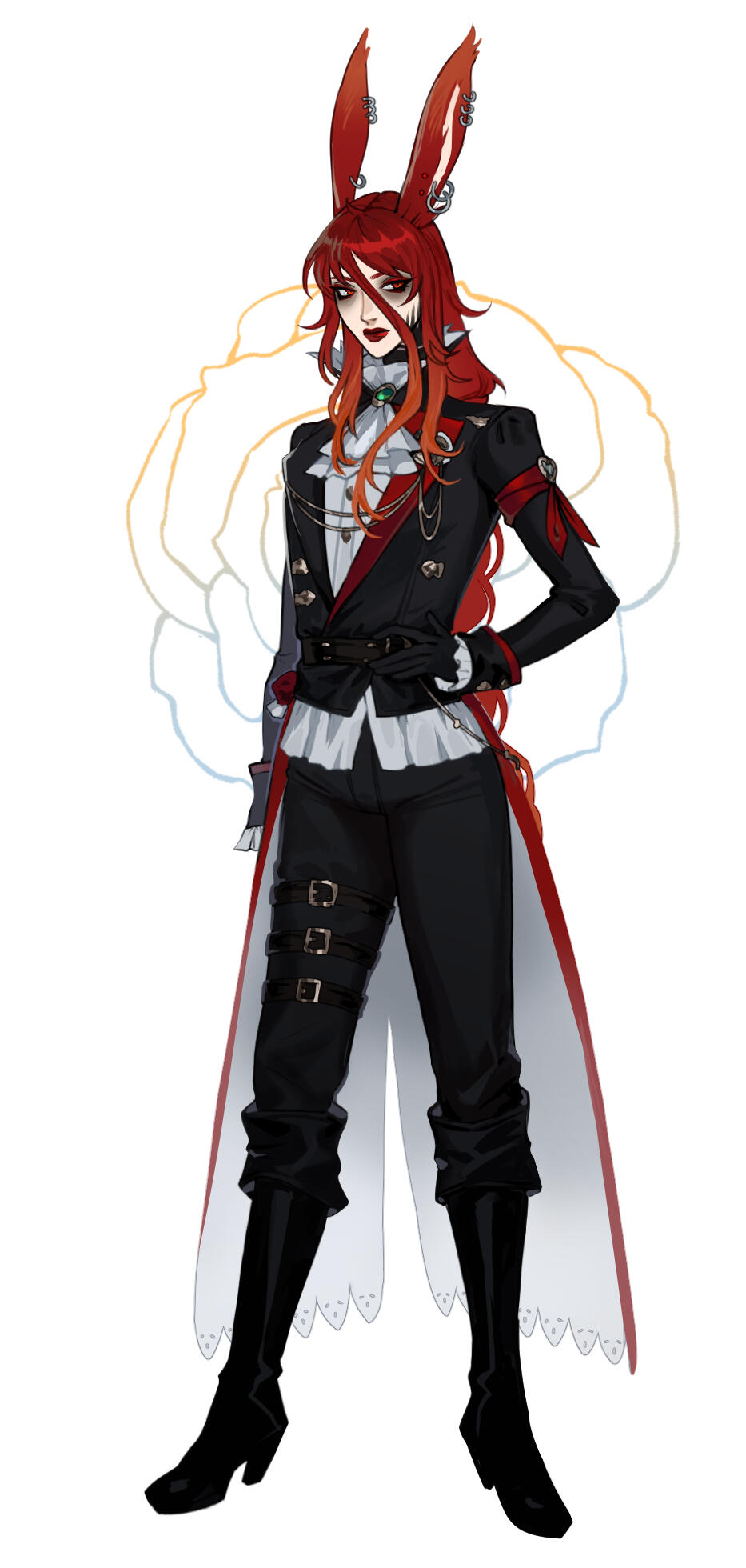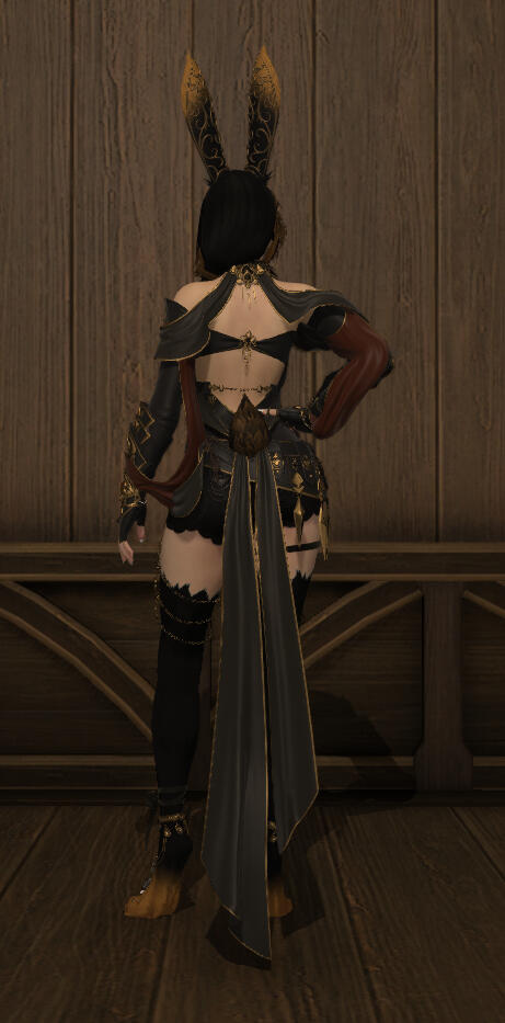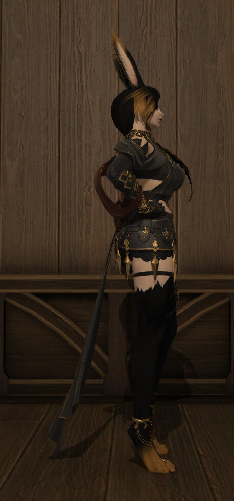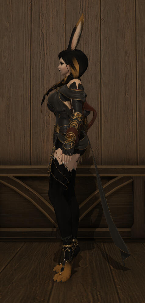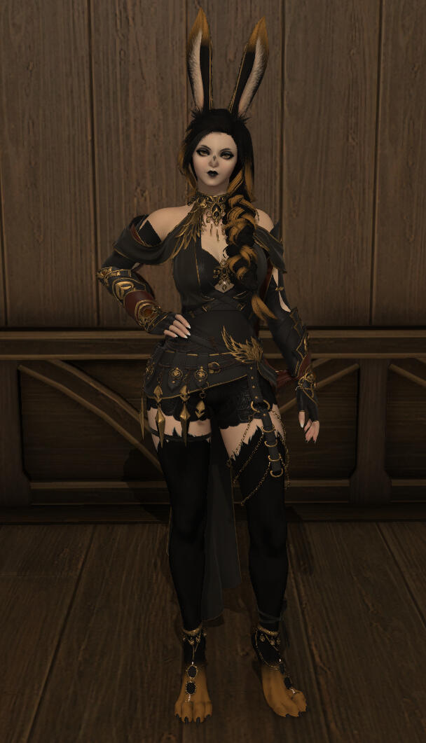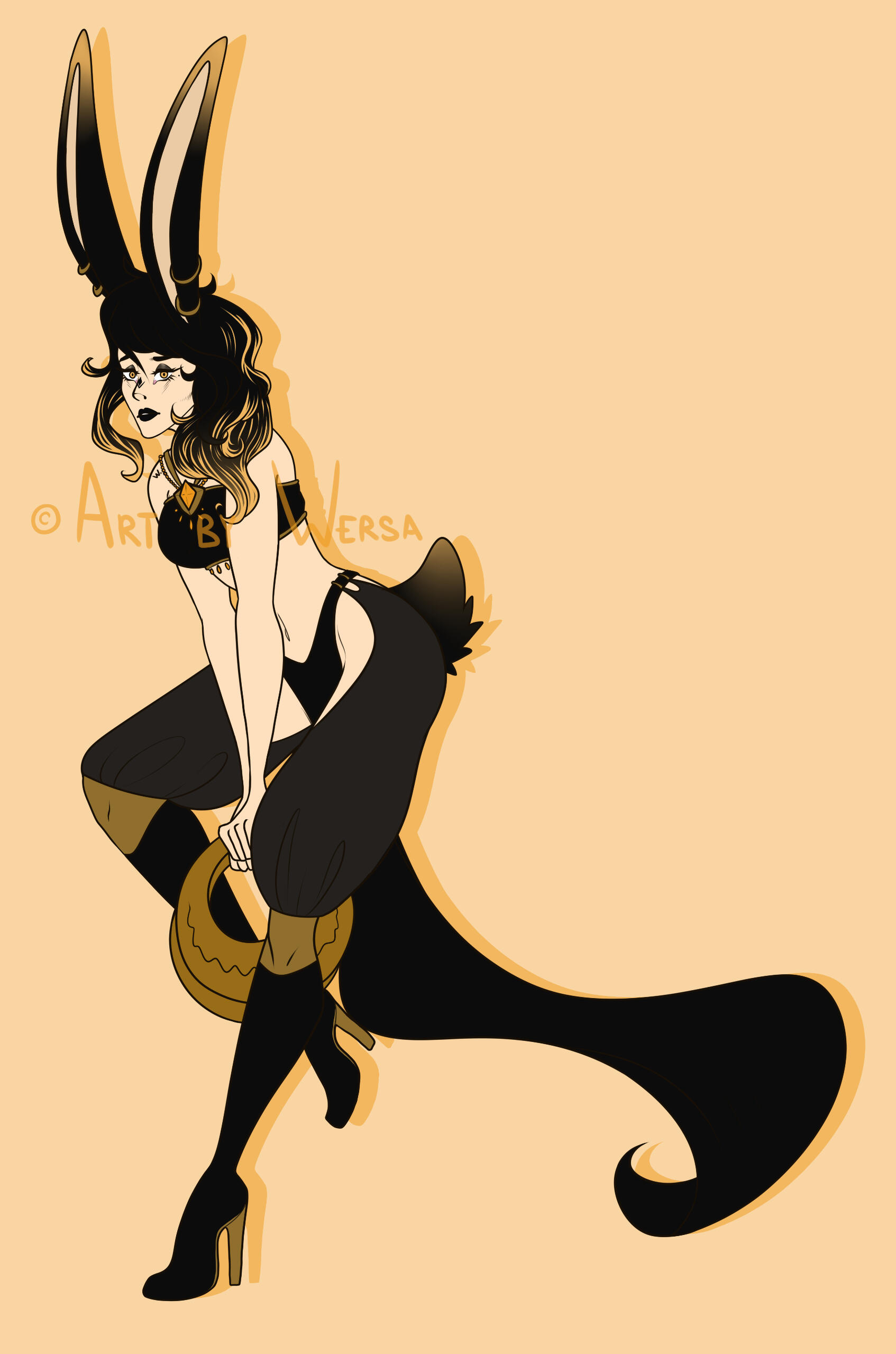 Aesthetics : Dark colors, especially black with gold accents, Gothic and to an extent emo themes, coins, dancing.Design notes : Gold has a tall and slender build. Her hair is neat and wavy, draped over her one shoulder usually. Sometimes in a braid. Has a bunny tail and paws!Don't hesitate to ask me if you are unsure about something!