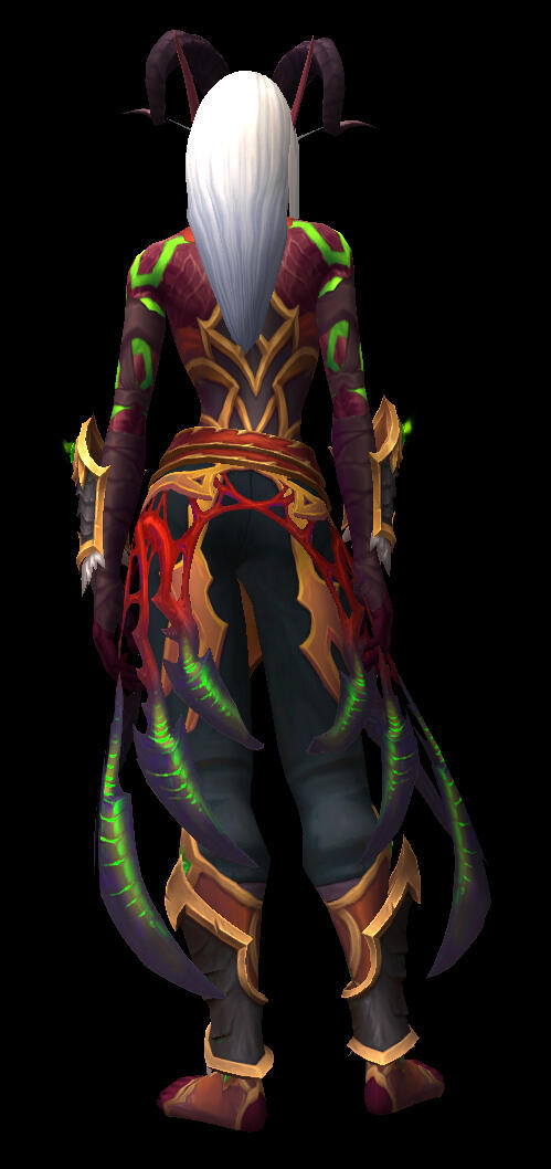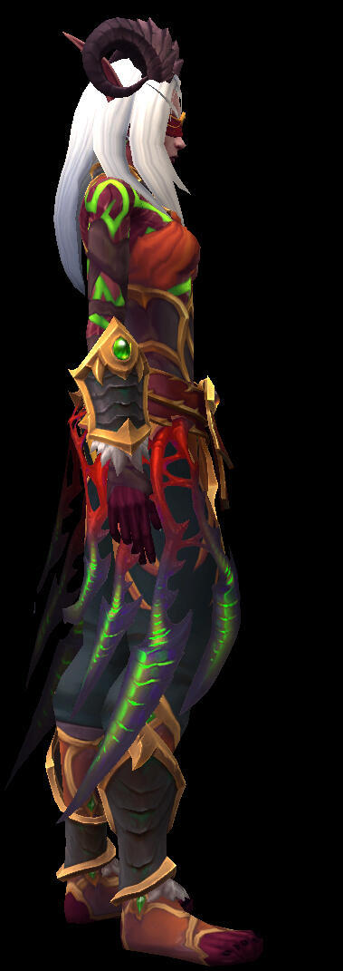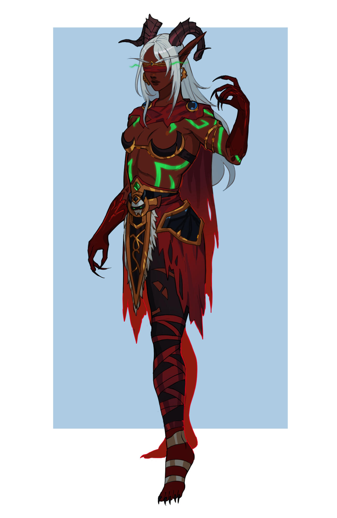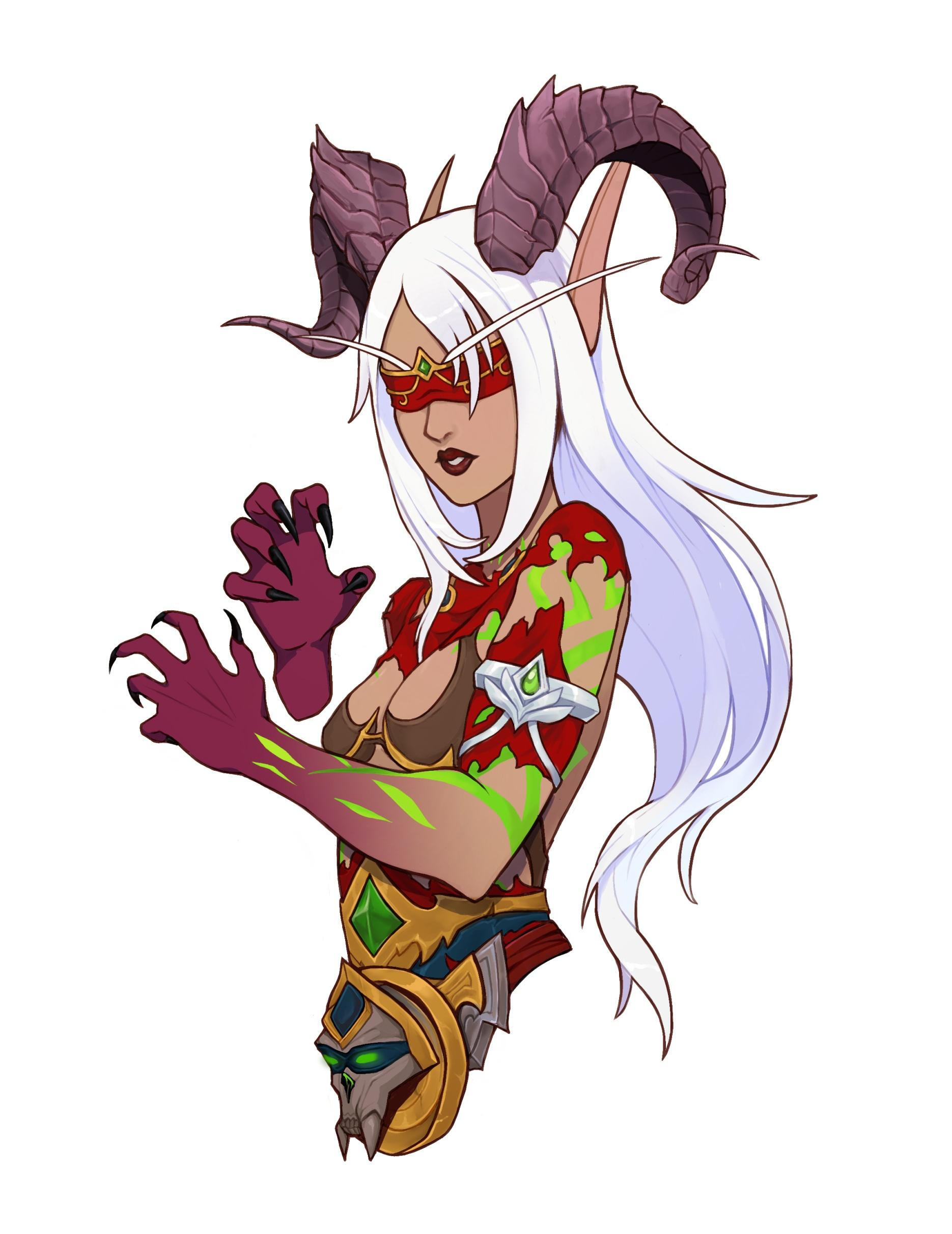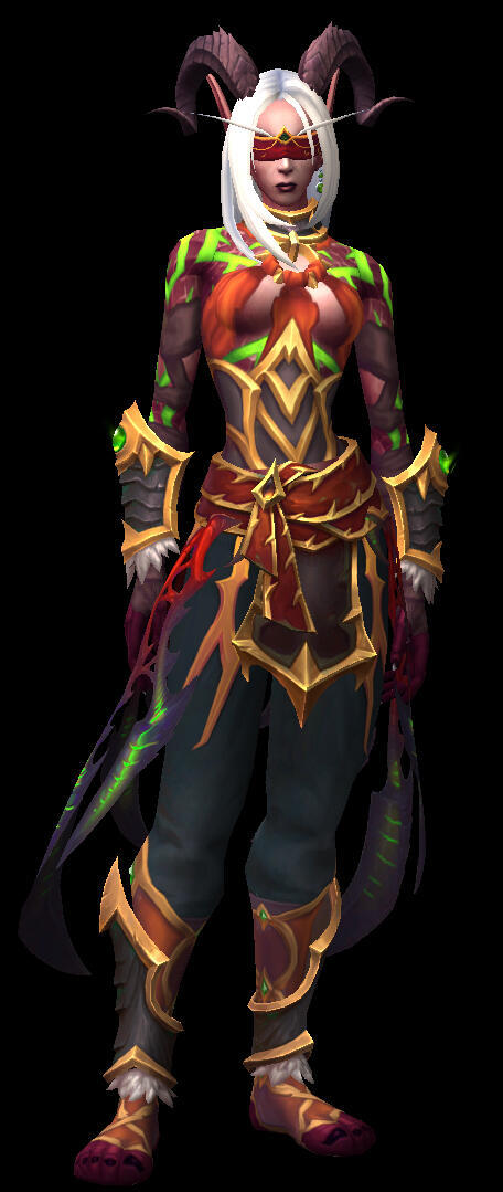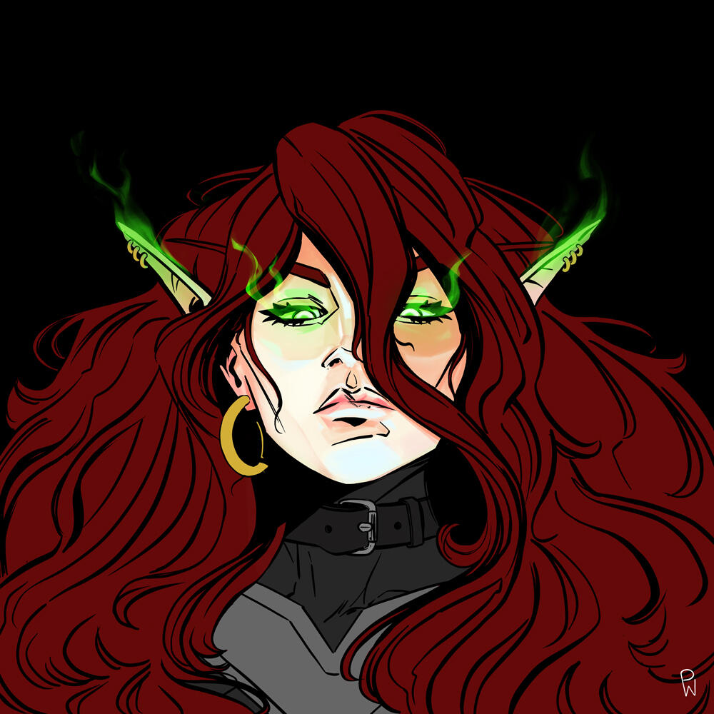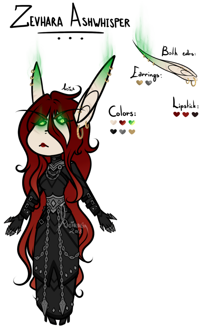 Aesthetics : Dark and gothic themes and clothing, Old dusty books, Hellfire / Fel fire, Forbidden magics, Leather and chains.Design notes : Zevhara has a thin, underweight body type - bones are showing through their skin. Their hair may be braided or loose. Jewelry may also vary.Don't hesitate to ask me if you are unsure about something!Important details to remember when you are drawing Zevhara :