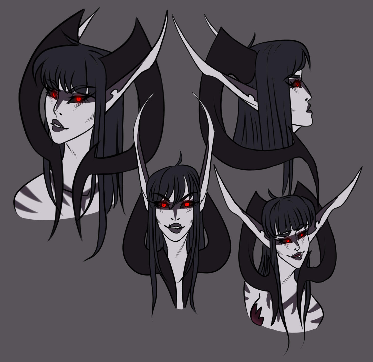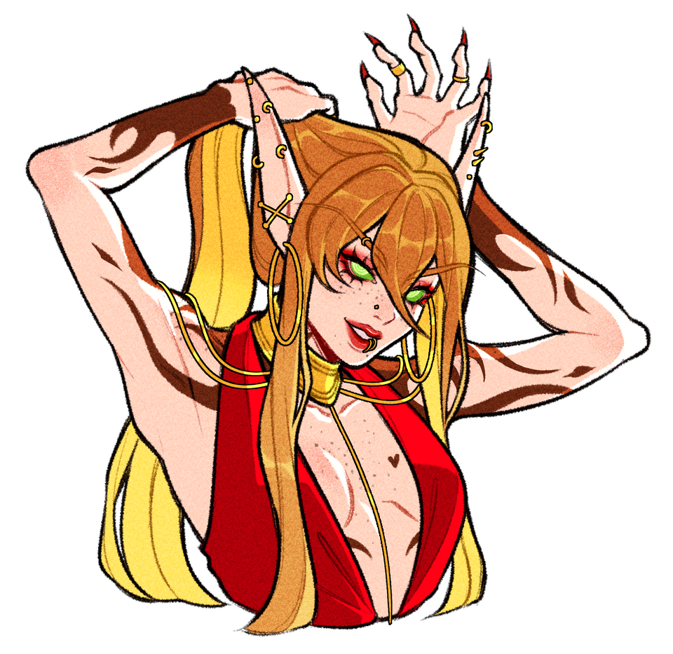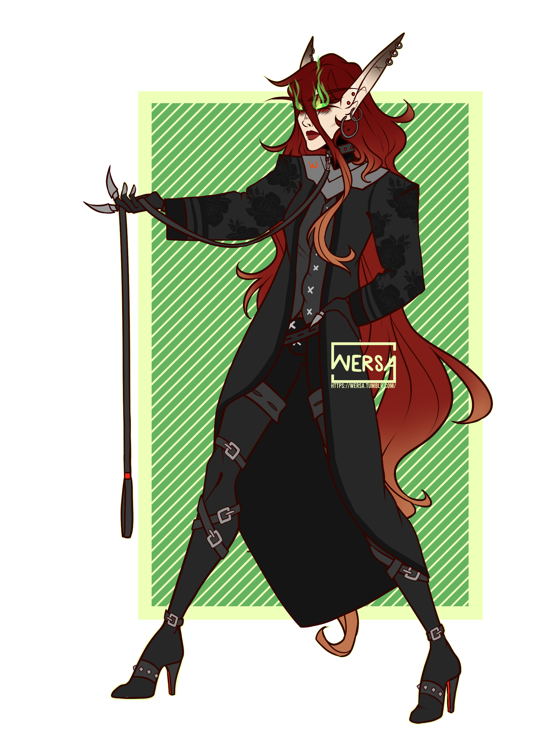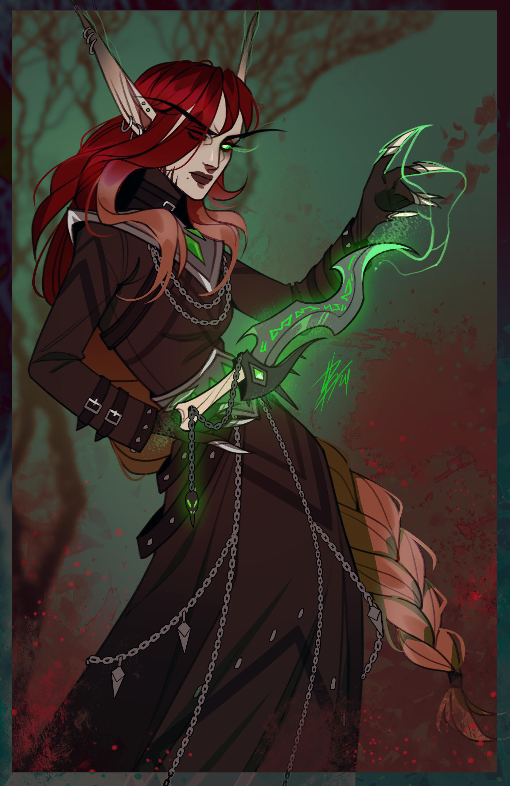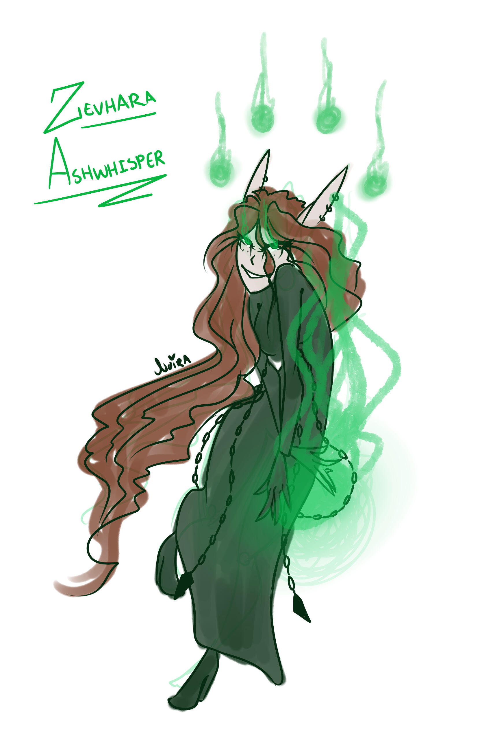 Aesthetics : Dark and gothic themes and clothing, Old dusty books, Hellfire / Fel fire, Forbidden magics, Leather and chains.Design notes : Zevhara has a thin, underweight body type - bones are showing through their skin. Their hair may be braided or loose. Jewelry may also vary.Don't hesitate to ask me if you are unsure about something!Important details to remember when you are drawing Zevhara :