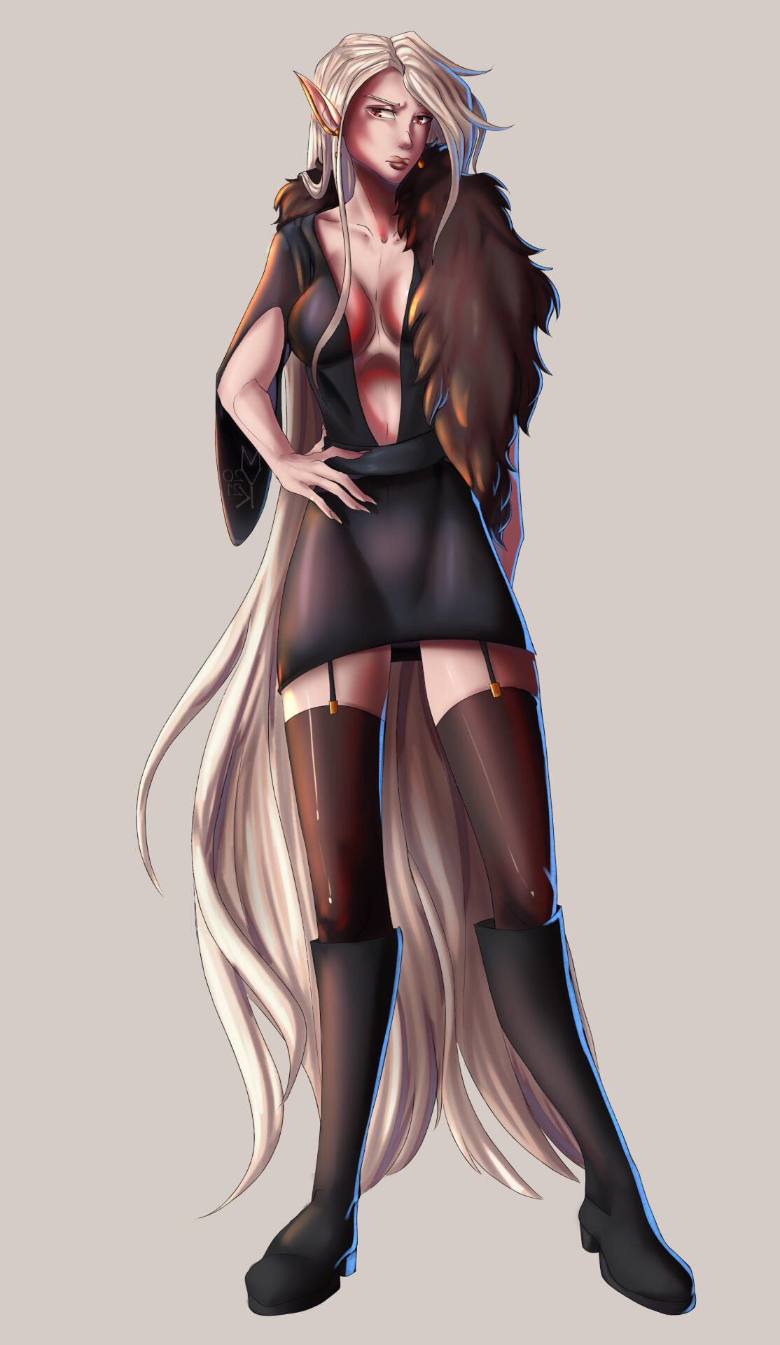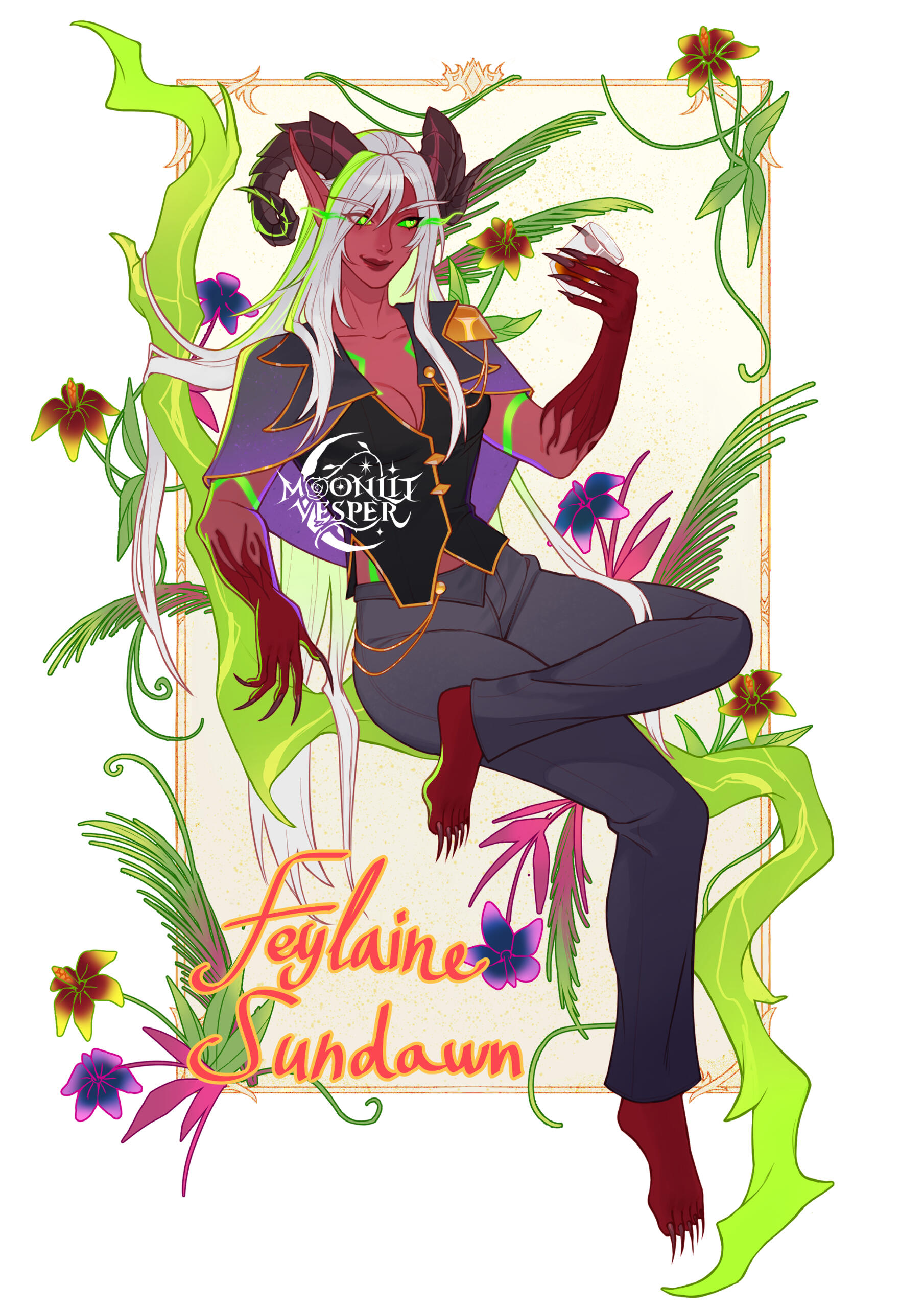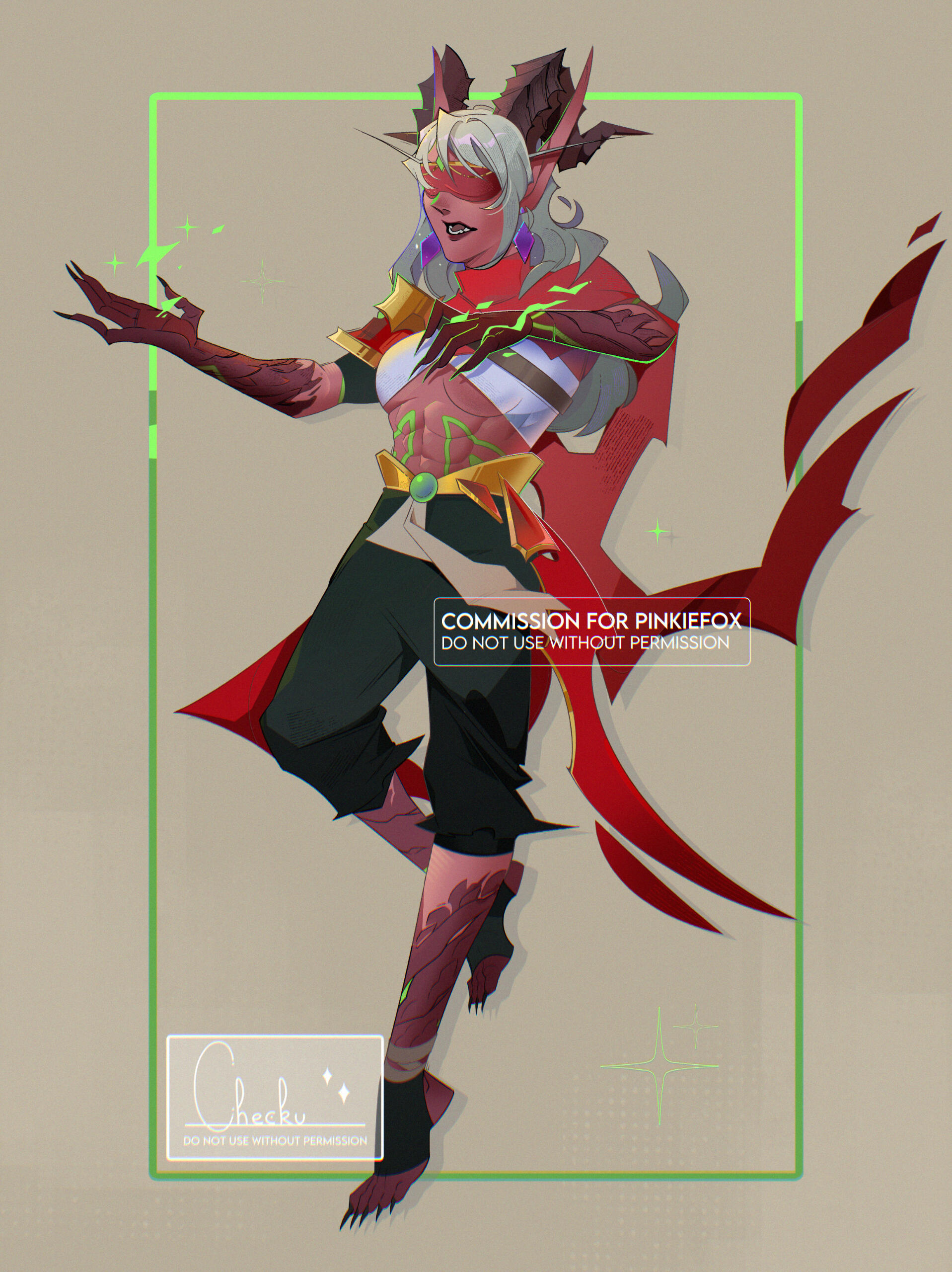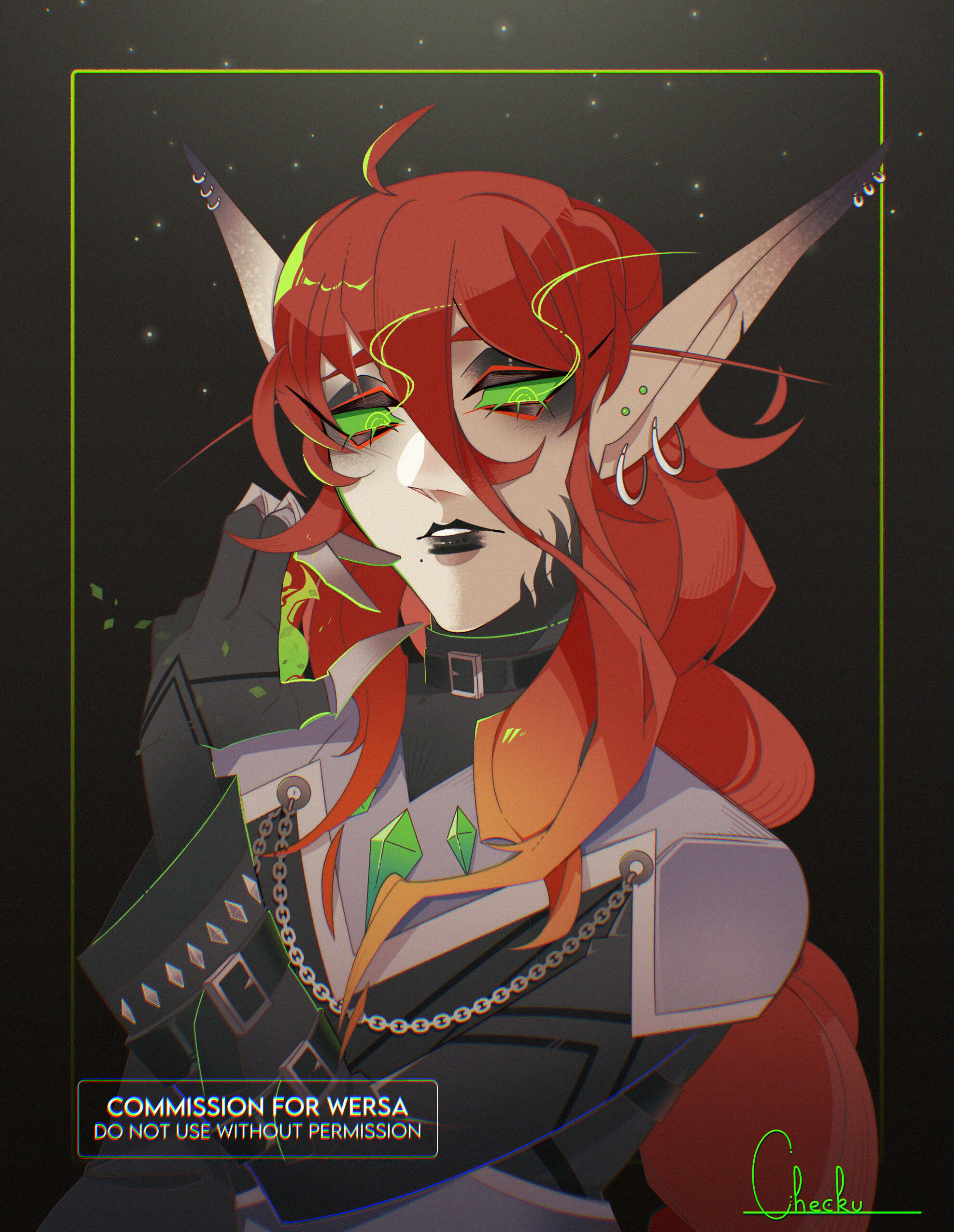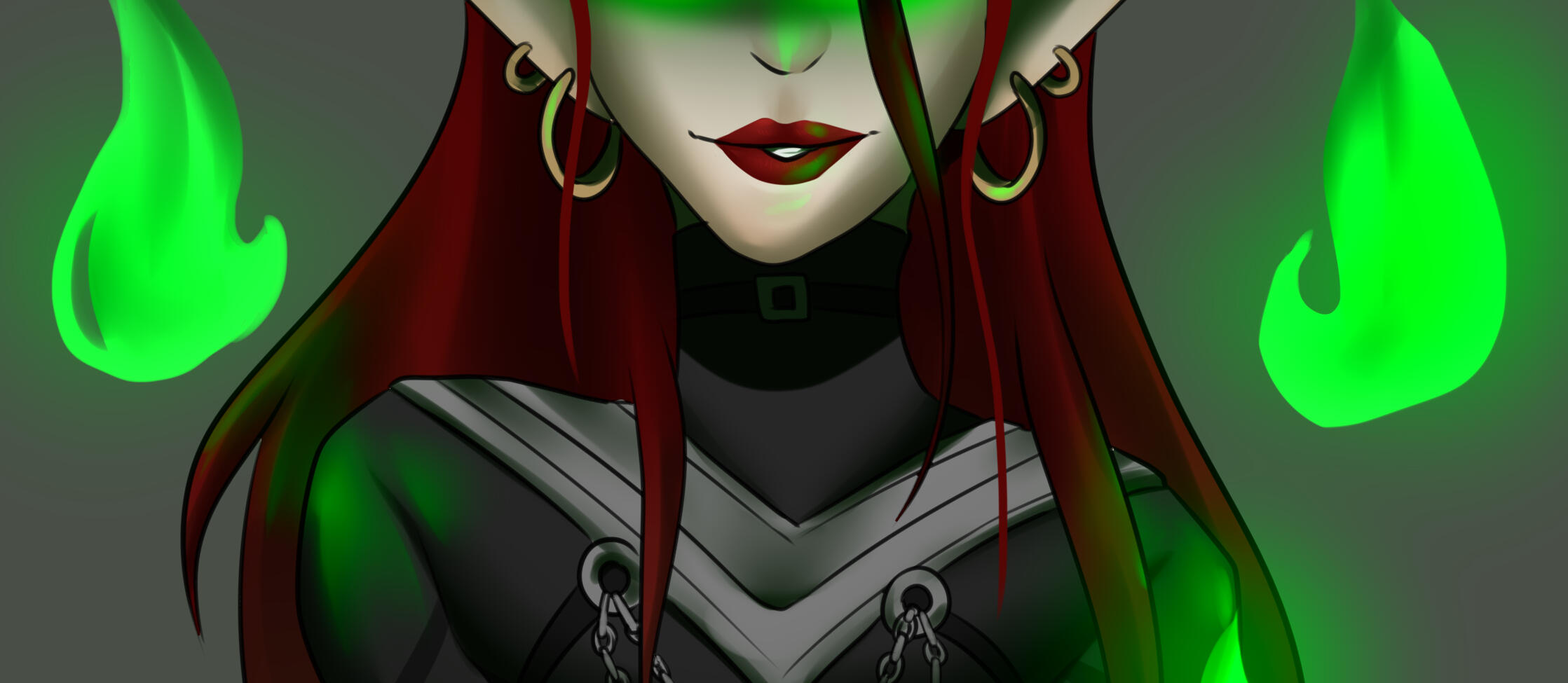 Aesthetics : Dark and gothic themes and clothing, Old dusty books, Hellfire / Fel fire, Forbidden magics, Leather and chains.Design notes : Zevhara has a thin, underweight body type - bones are showing through their skin. Their hair may be braided or loose. Jewelry may also vary.Don't hesitate to ask me if you are unsure about something!Important details to remember when you are drawing Zevhara :