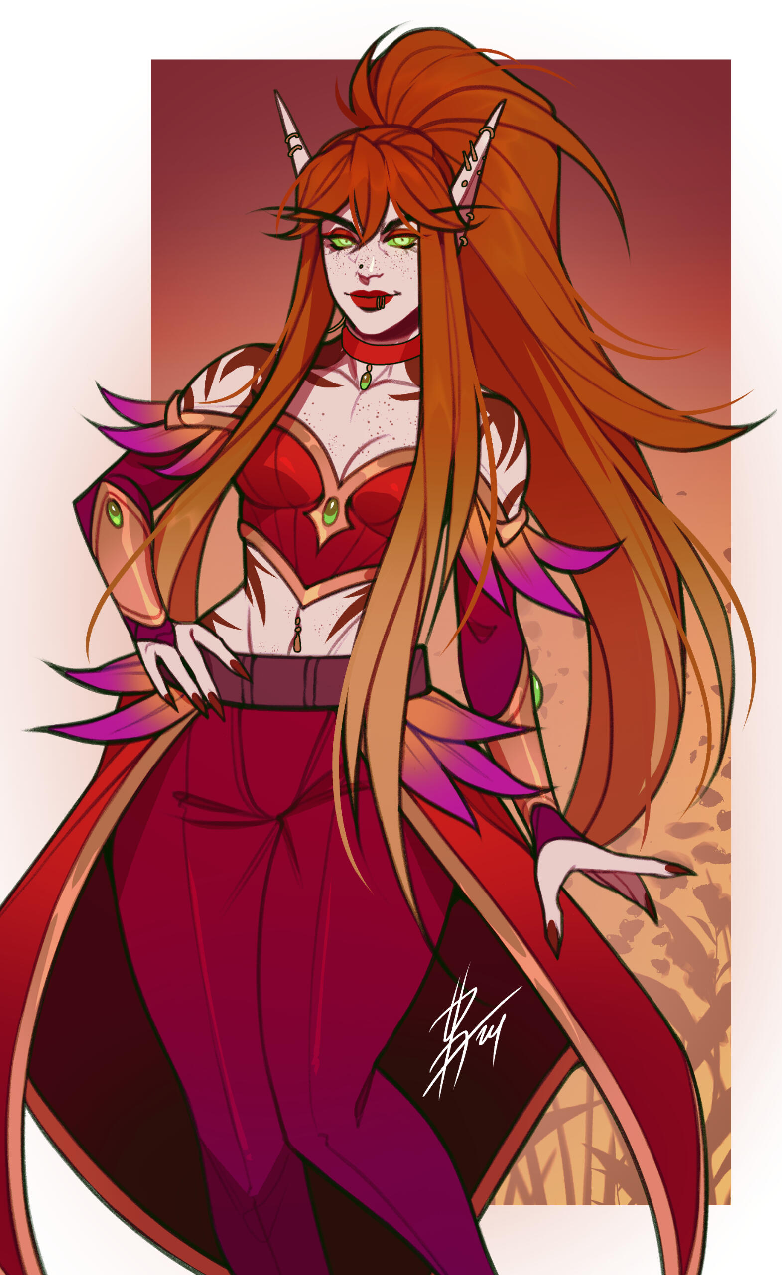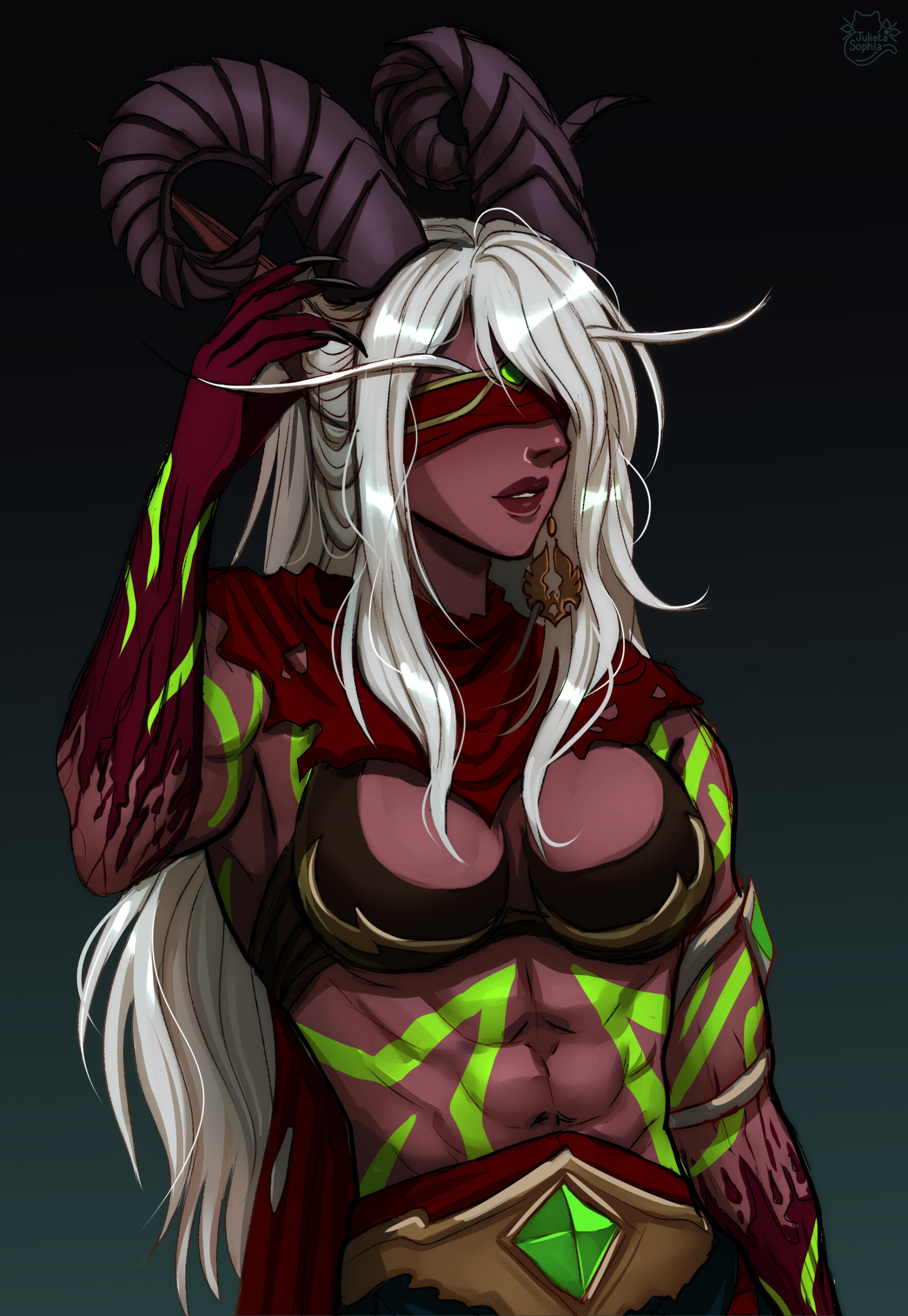 Aesthetics : The colors red and green, fel fire, veils, succubi and imp themes, clawed hands, jewelry, cat-like gestures.Design notes : Alydia is fairly short, with a fit build. She is a Demon Hunter, which means that she tends to wear a veil over her face! Spiky. Hair usually kept in a ponytail.Don't hesitate to ask me if you are unsure about something!Important details to remember when you are drawing Alydia :