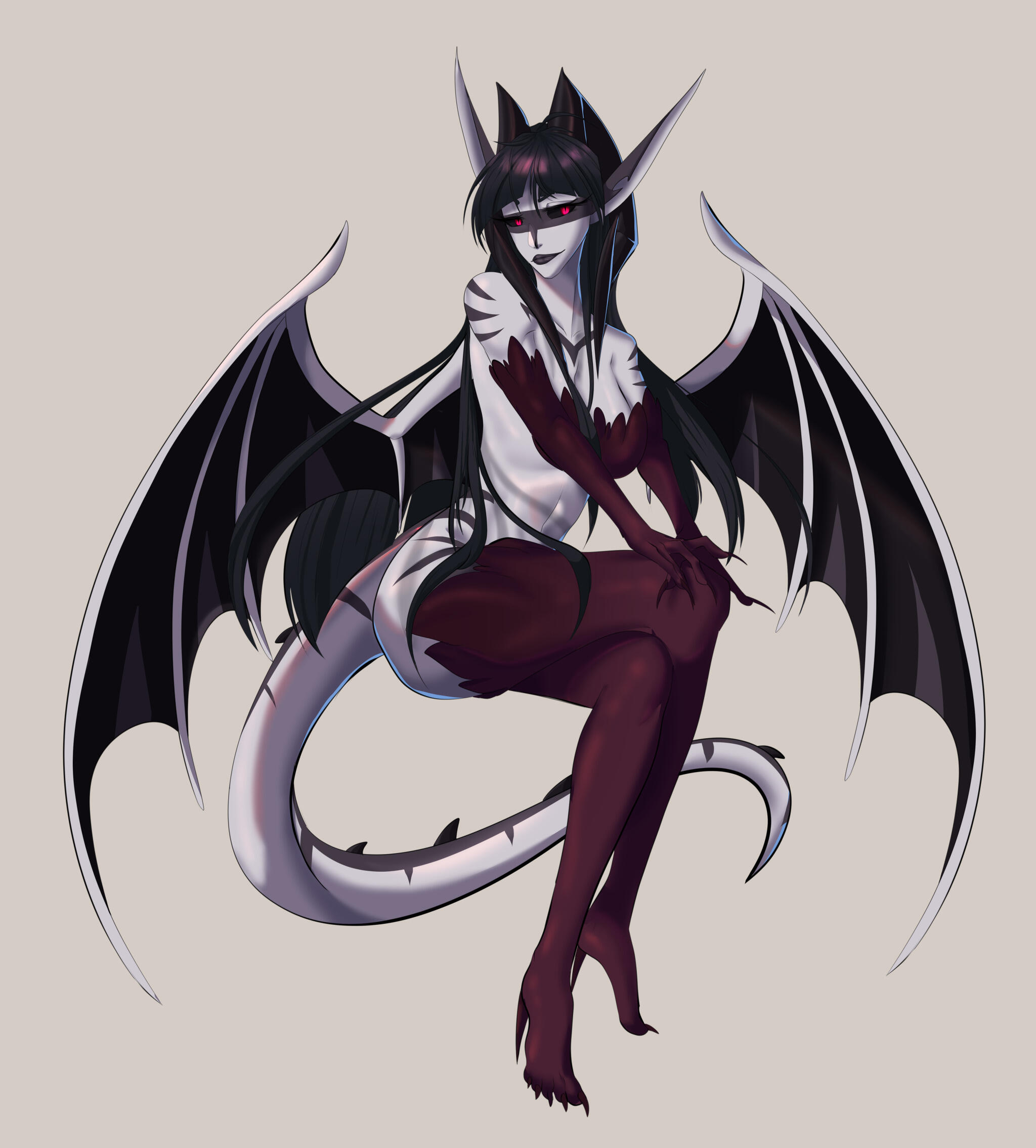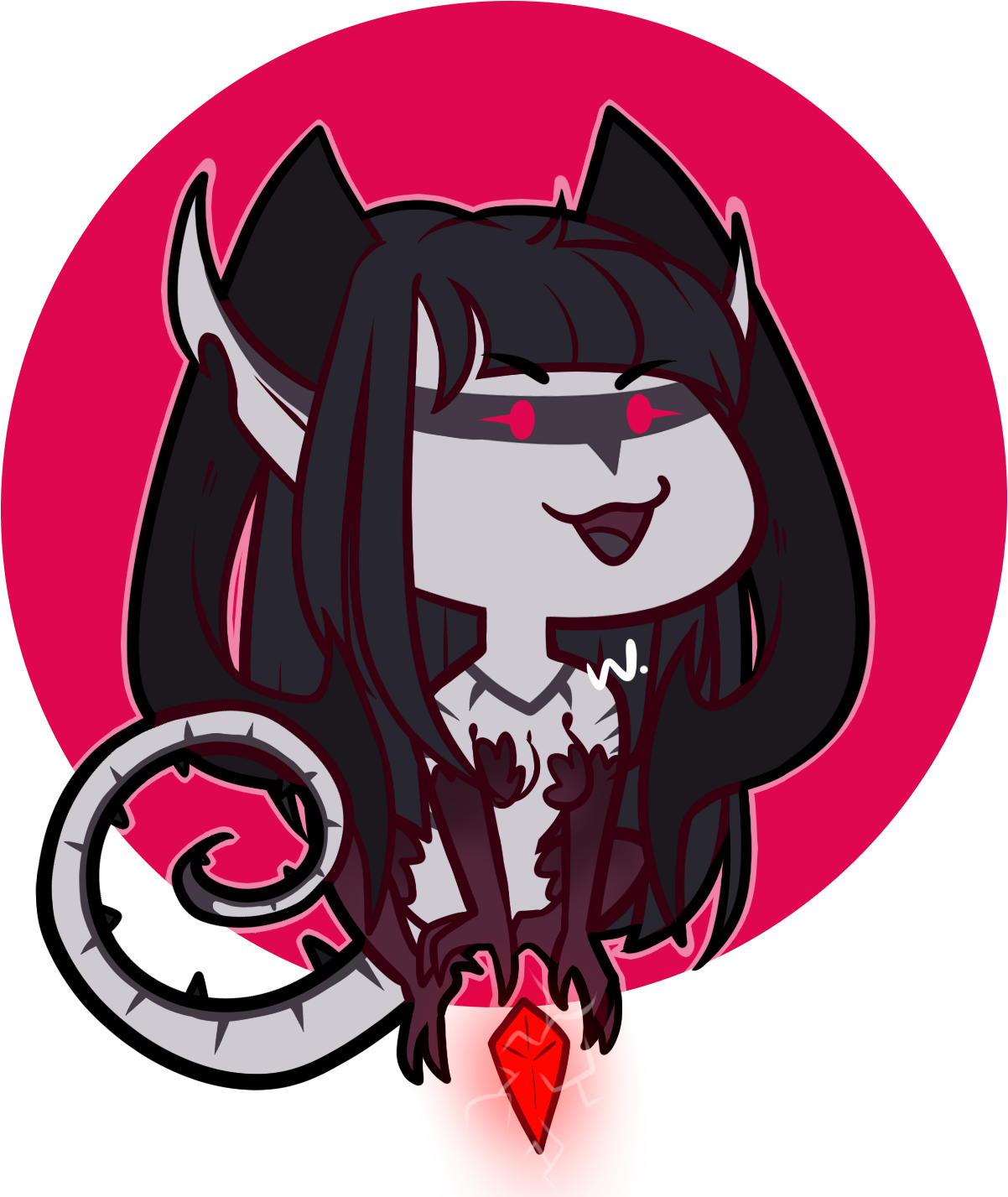 Eyes have black scleras, and her irises may range from pink ( when feeding and using her magic ) to red ( any other time ), basically they can be any color off this gradient!