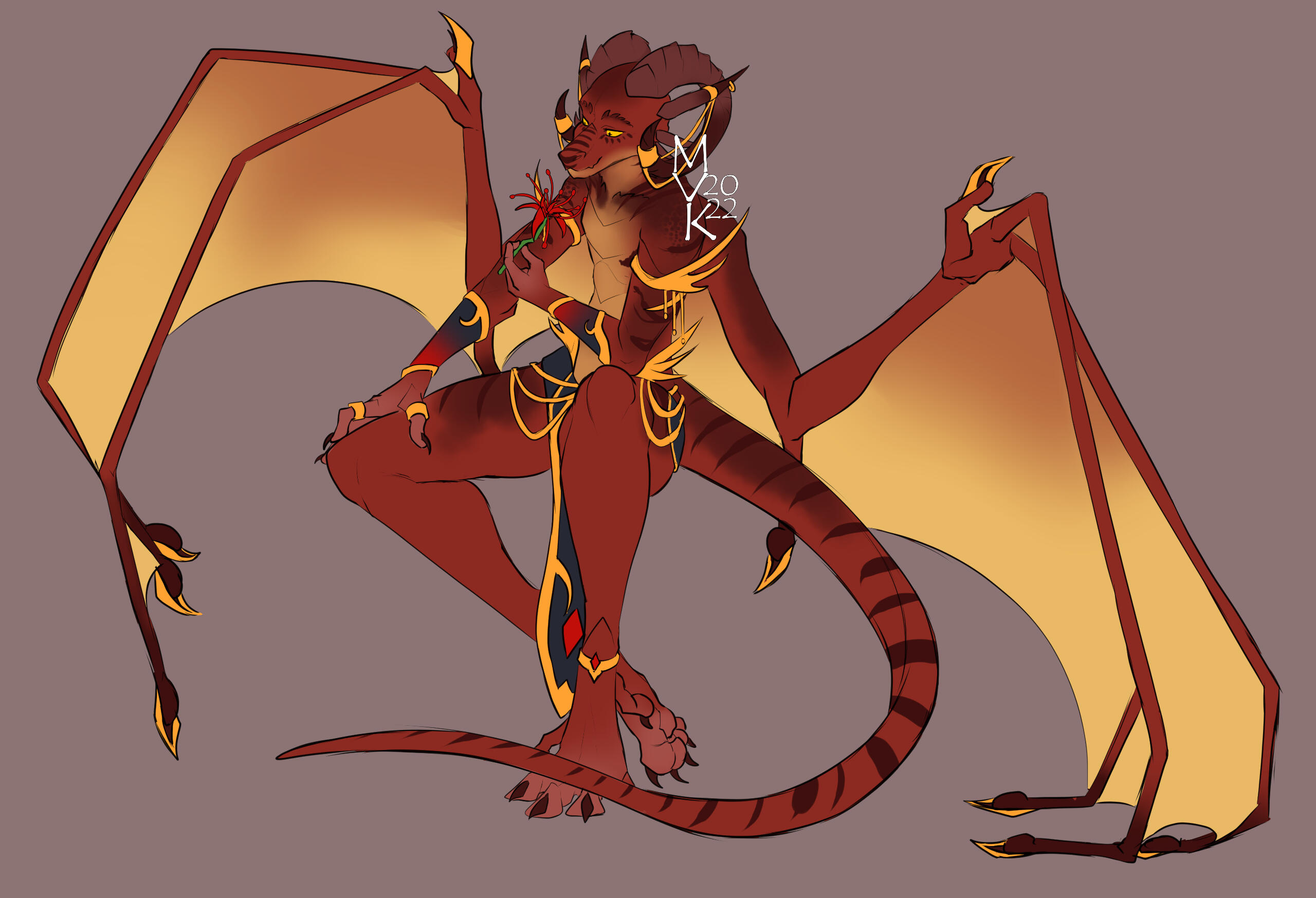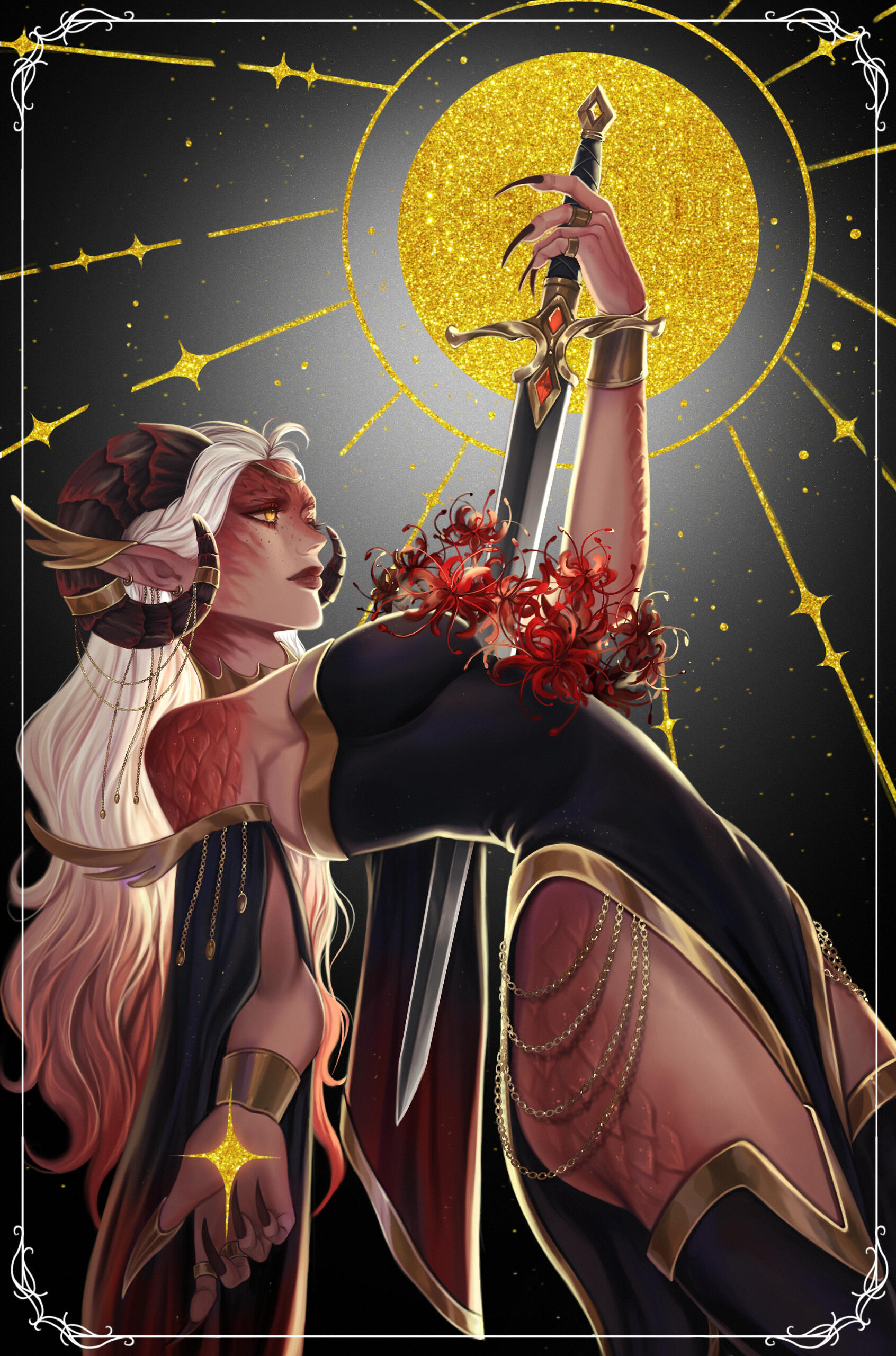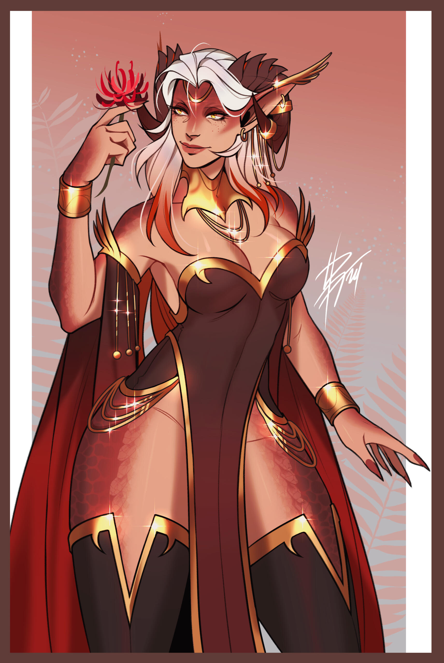 Aesthetics : Life ( Especially plant life and nature. ), Red fire, Gold jewelry, Dragons, Kindheartedness, spider lilies.Design notes : Ciresh has a fit, if curvaceous body type. She is a Dracthyr, which means that her natural form is that of a dragon-like creature, while her visage form is more elven in nature. Either form may be drawn for her!Don't hesitate to ask me if you are unsure about something!Important details to remember when you are drawing Ciresh :
