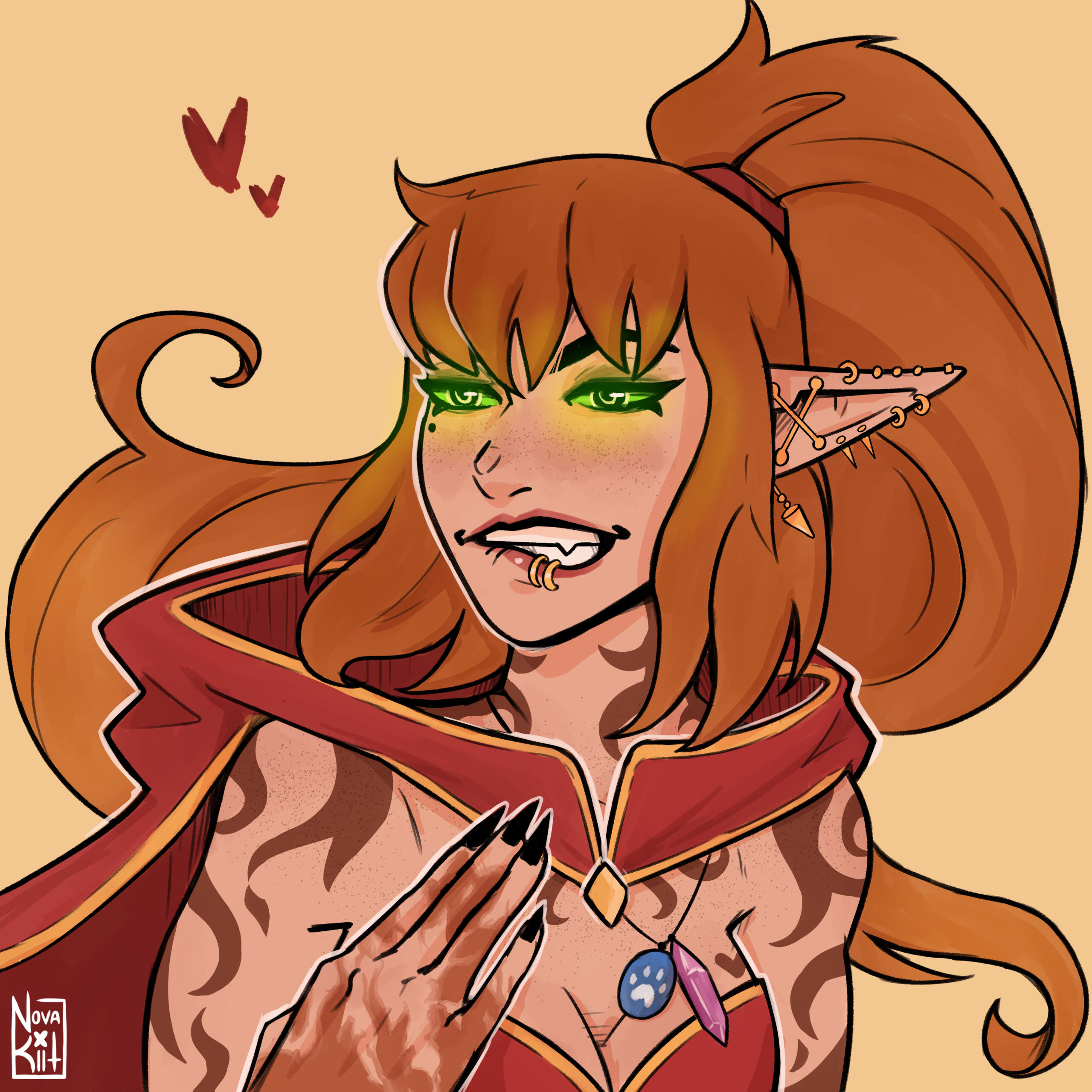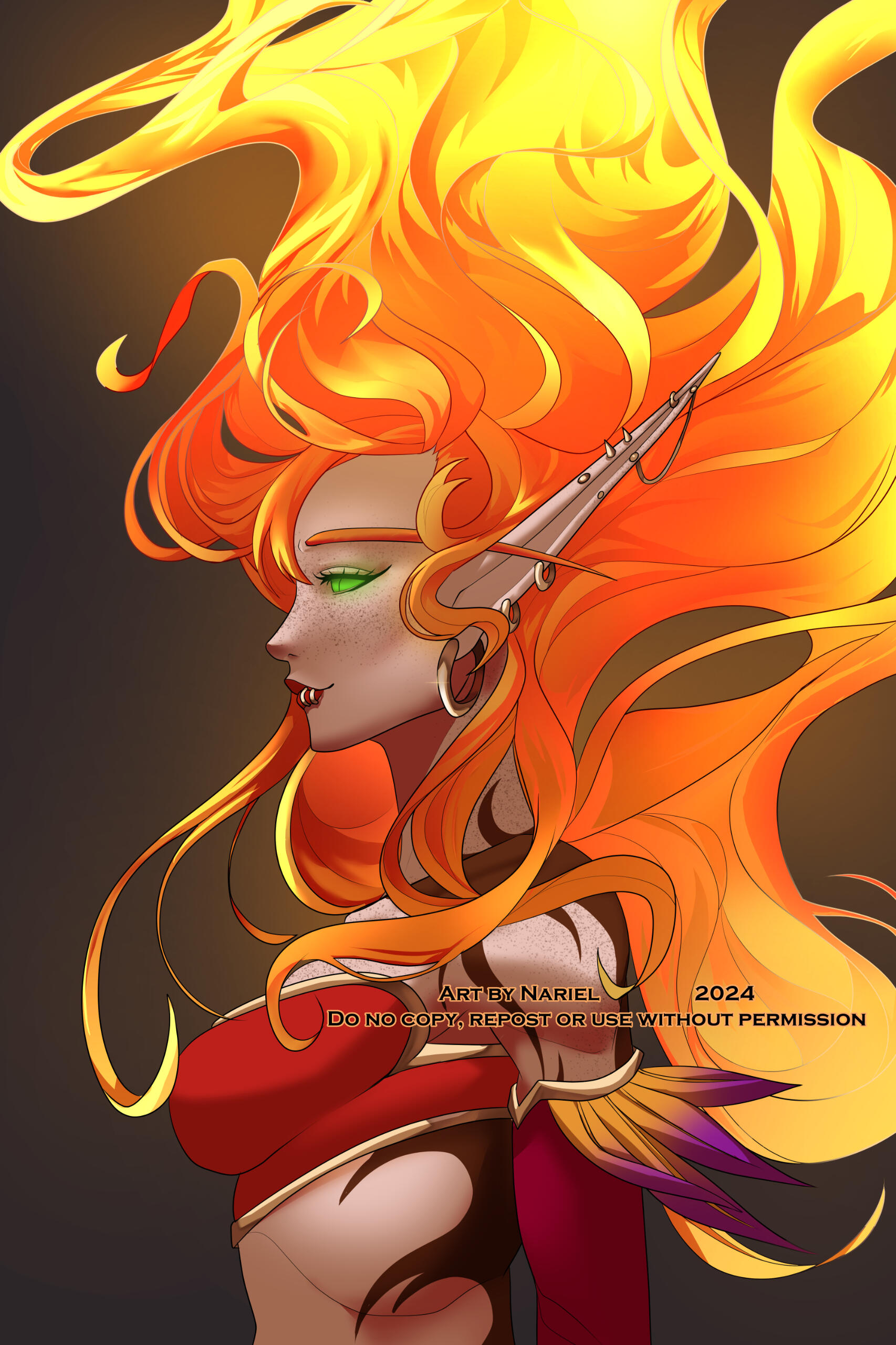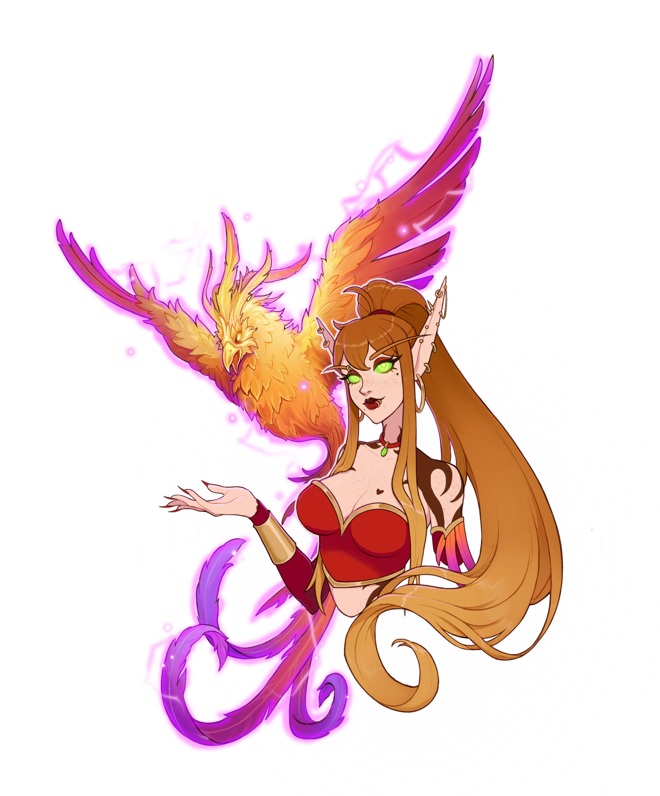 Aesthetics : Fire, Dancing, Reds and gold sprinkled with black, Romance novels, Birds of all kinds, Phoenixes, Body modifications.Design notes : Aomora has a fit, curvaceous body type. Her hair is always tied in a long ponytail. Her body mods are many, but jewelry such as earrings may vary in placement and such. Her tattoos glow up like fire during spellcasting.Don't hesitate to ask me if you are unsure about something!